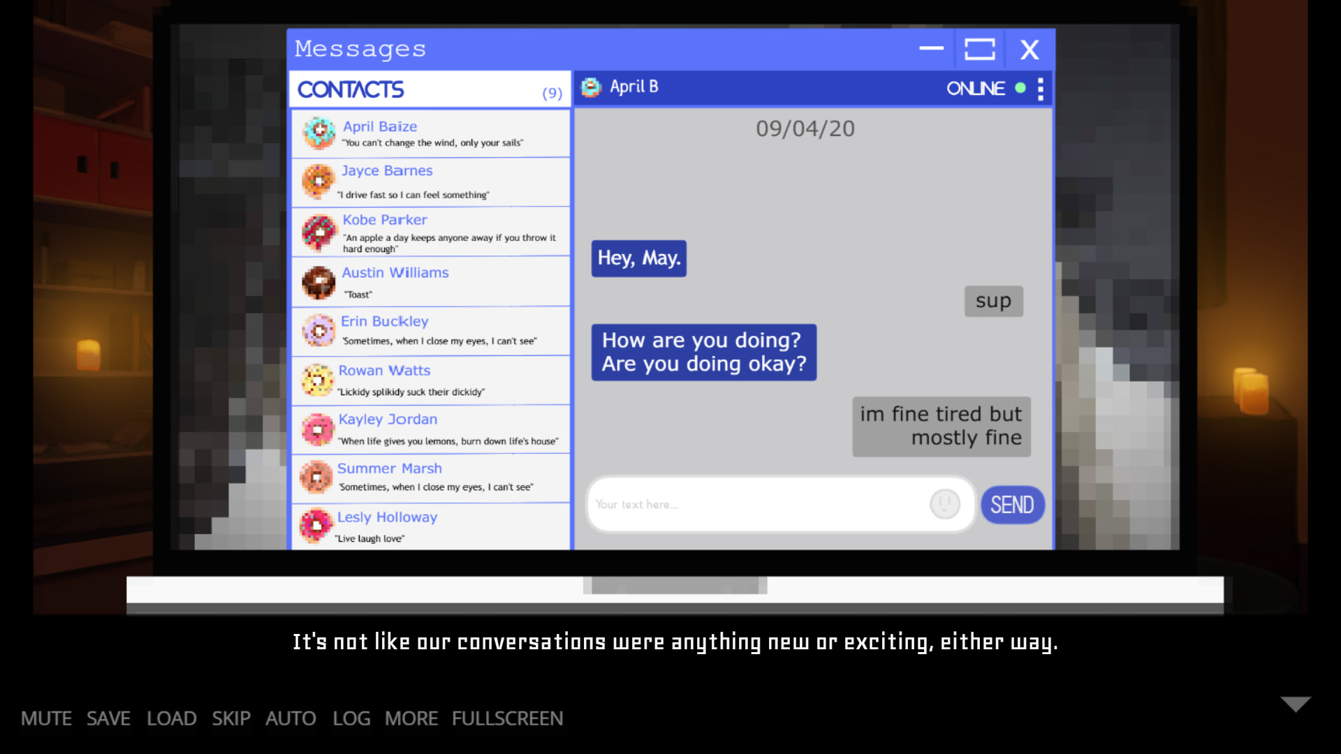 We follow May's online conversations with her best friend April through their fourth year of university. April, an aspiring writer, continuously sends May letters. Letters that have been piling up in various spots of May's dorm over the last few months. It may be too late when she finds out what's really in her letters.