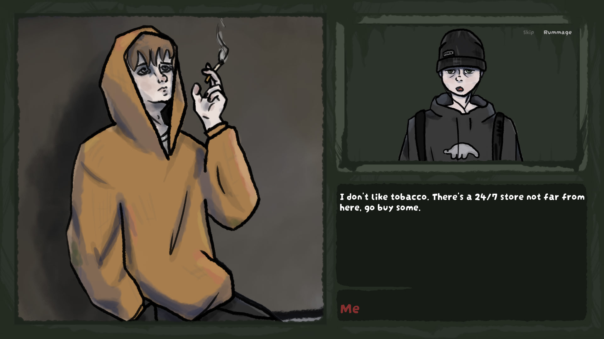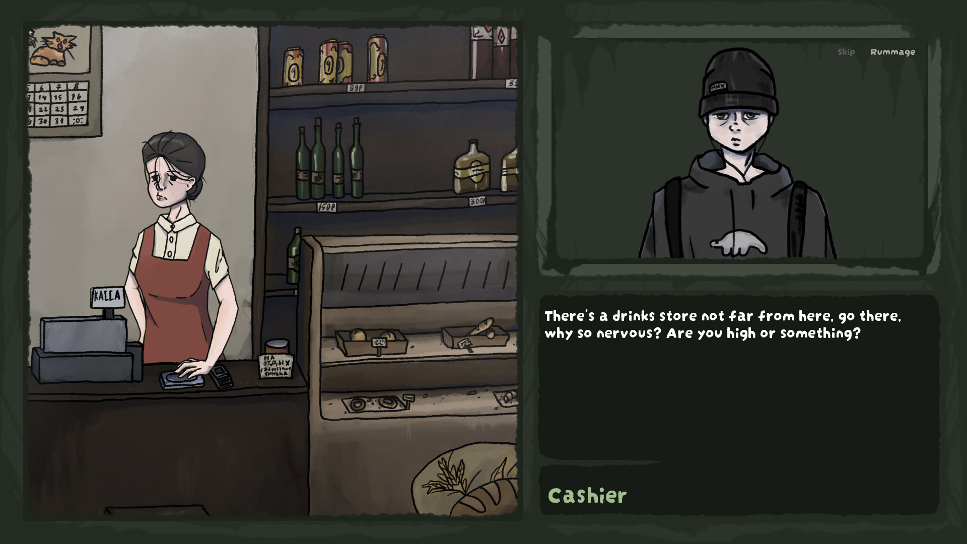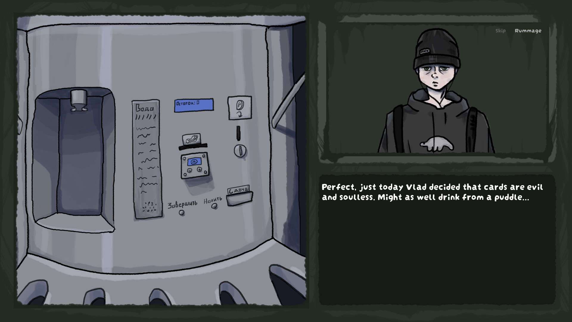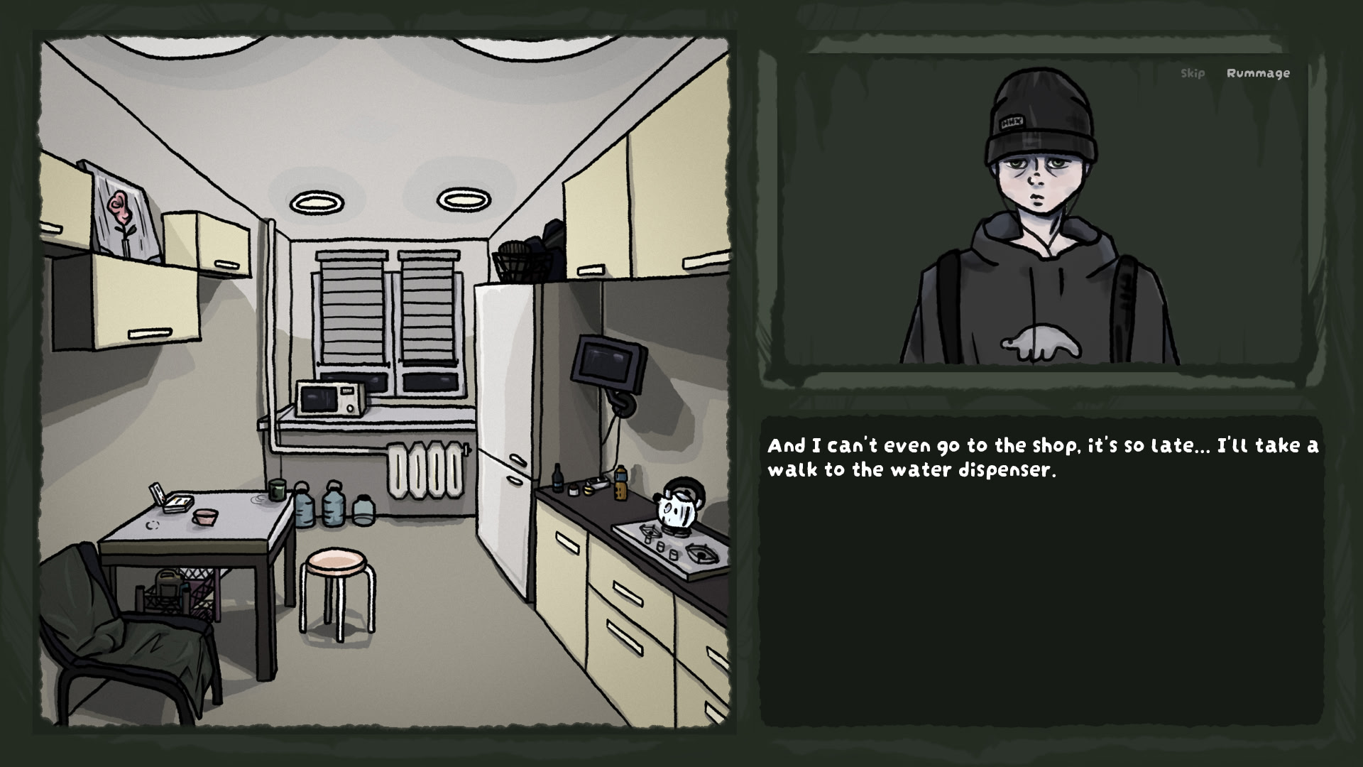The plot begins with a basic human need: thirst. You need water. All the stores are closed, and it’s late at night. What will your path be? Itch.io]