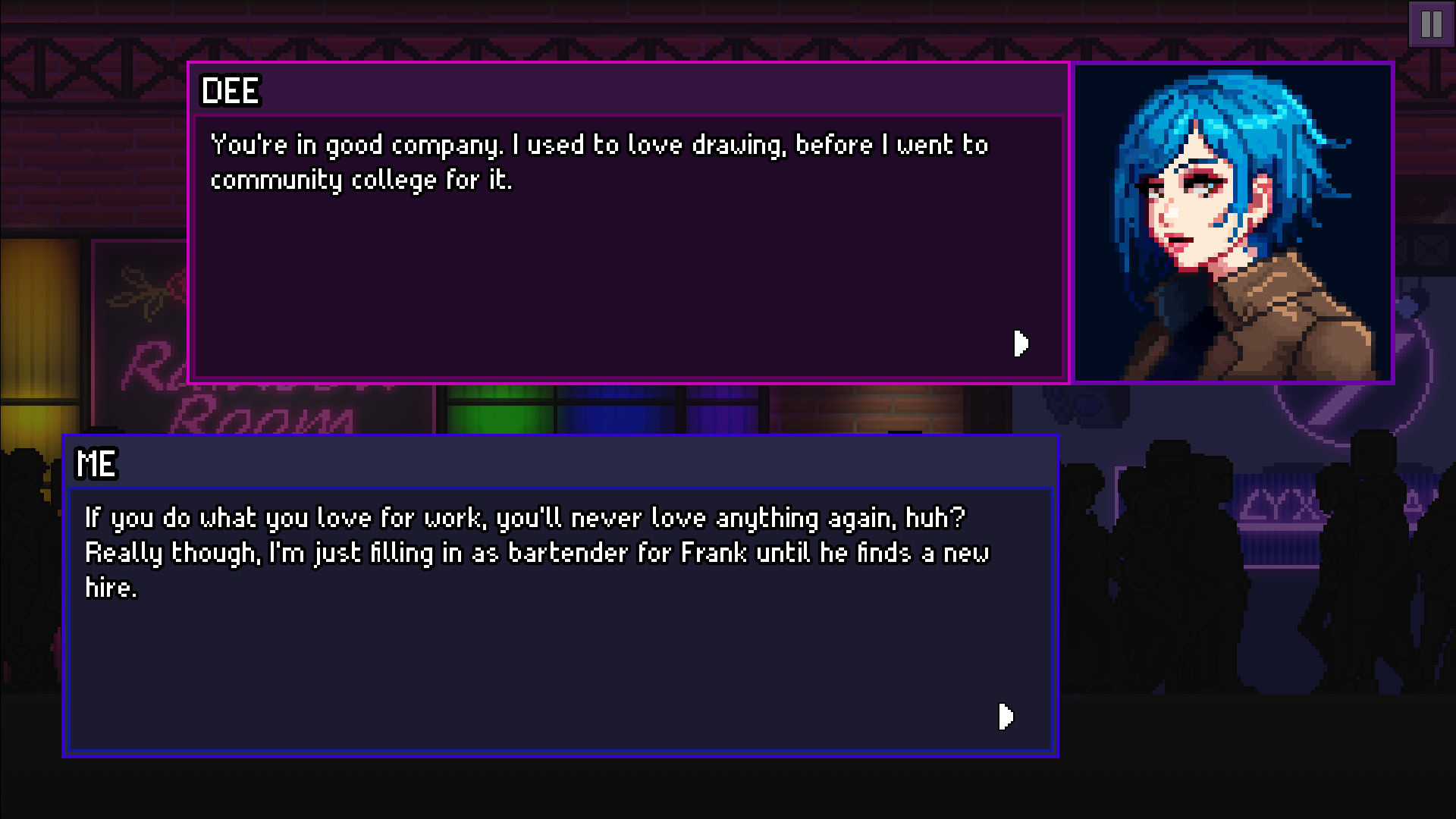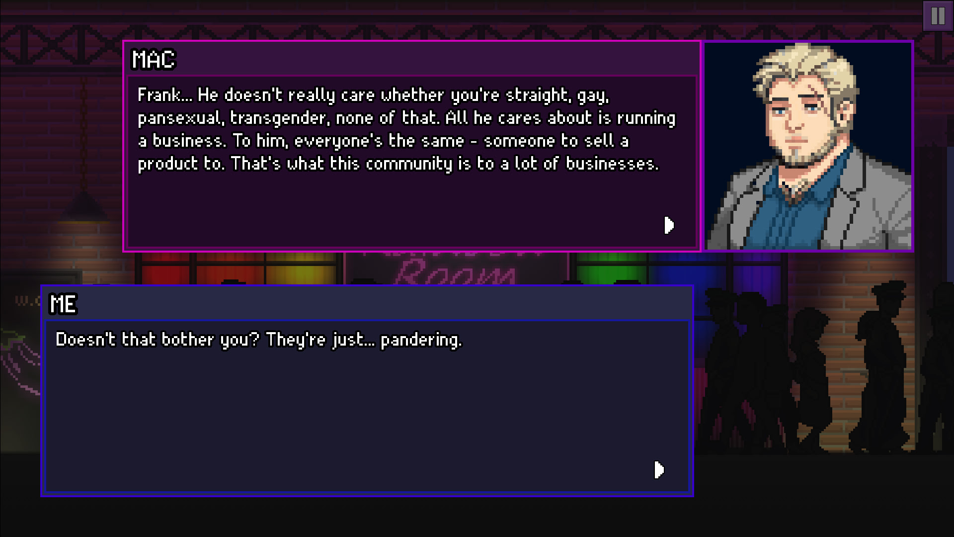 Uncle Frank has asked you to work at his gay bar for the night. Serve drinks, listen to the woes and drama of the patrons, and offer questionable advice to tipsy people! Itch.io]