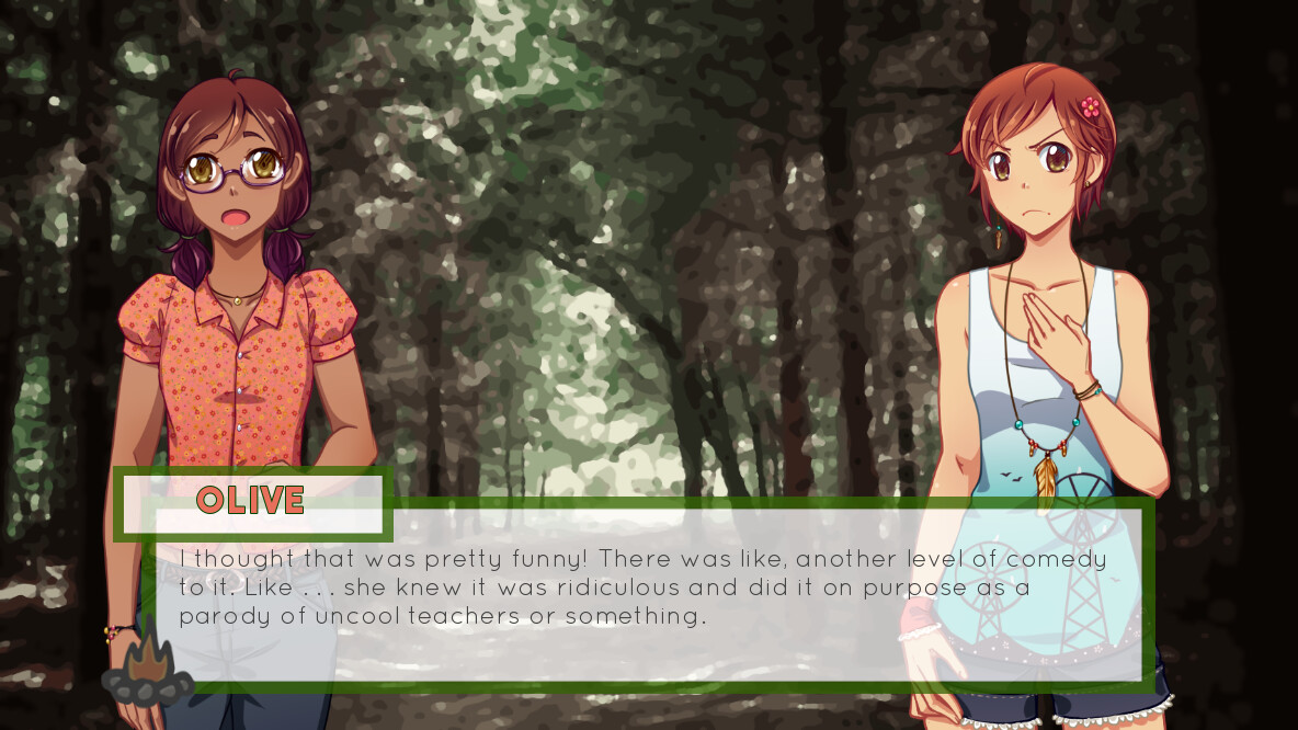When an argument with another classmate spurs the hot-tempered Sage to run off alone into the woods, Olive follows her, hoping to lift her spirits and make sure she’s safe. But the bubbly and energetic Heather has the same idea, and tensions between her and Sage threaten to turn the trip into even more of a disaster than it is already.