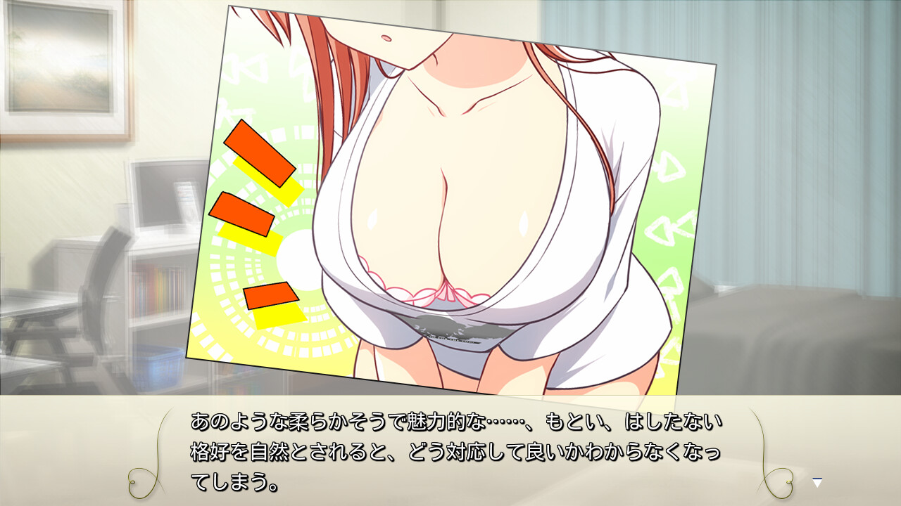 Her large breasts, in particular, are enough to stir the protagonist's heart...