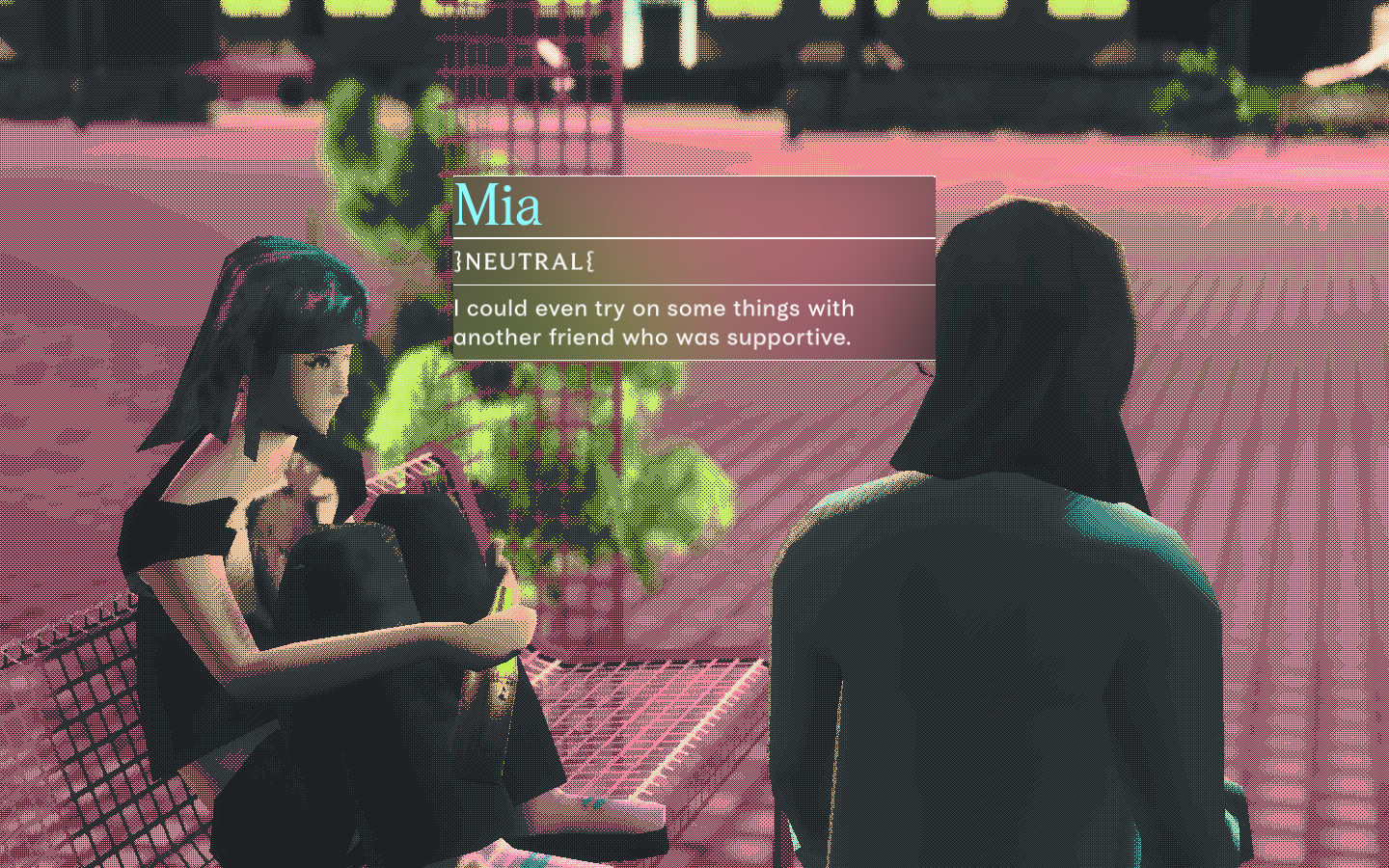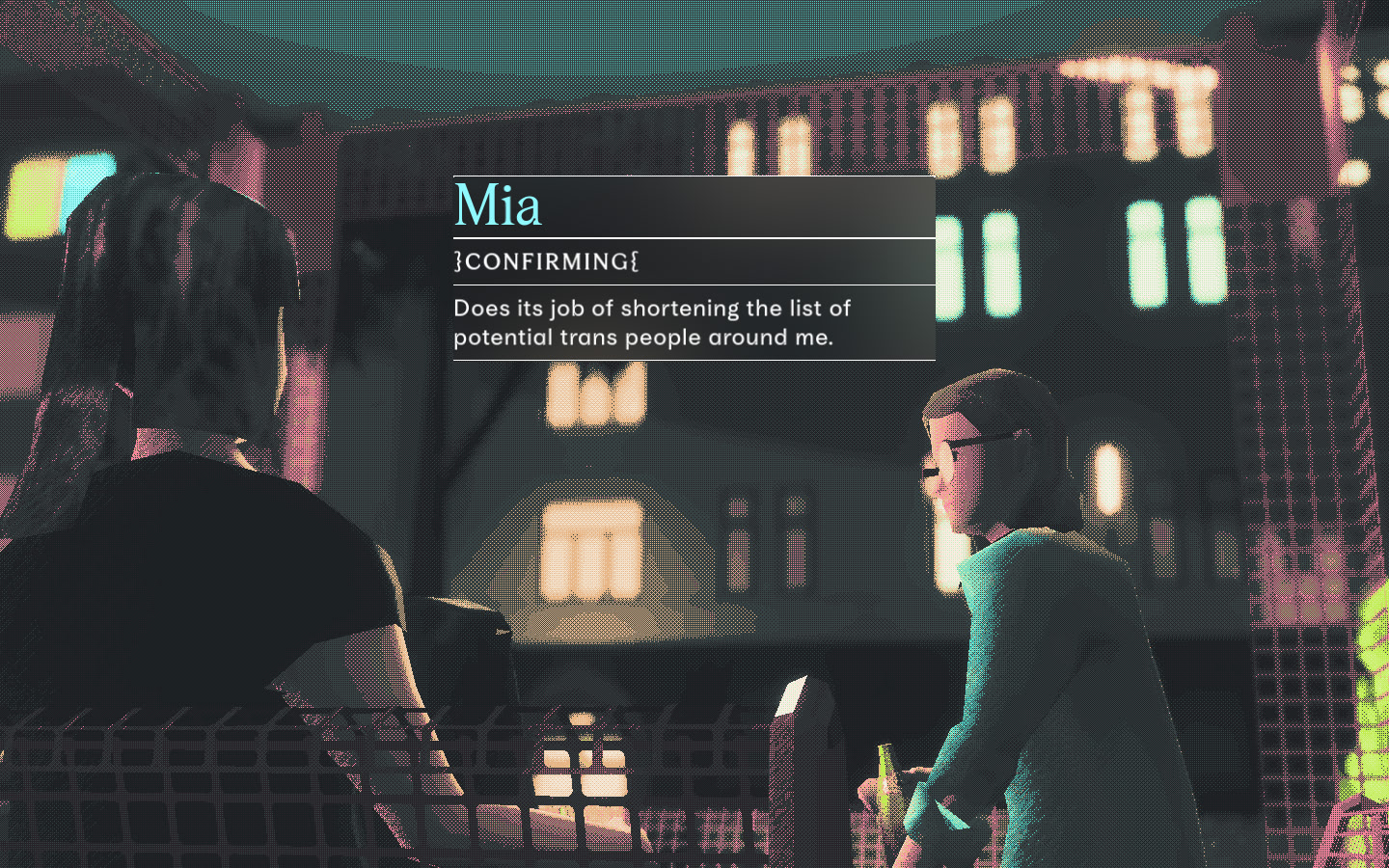 It’s one of those lovely summer evenings in Cologne. The sun starts to set around 11 p.m. The temperature has cooled to a comfortable level. The local kiosk is stocked with refreshing drinks. Two trans girls meet up to talk while watching the sunset. Itch.io]