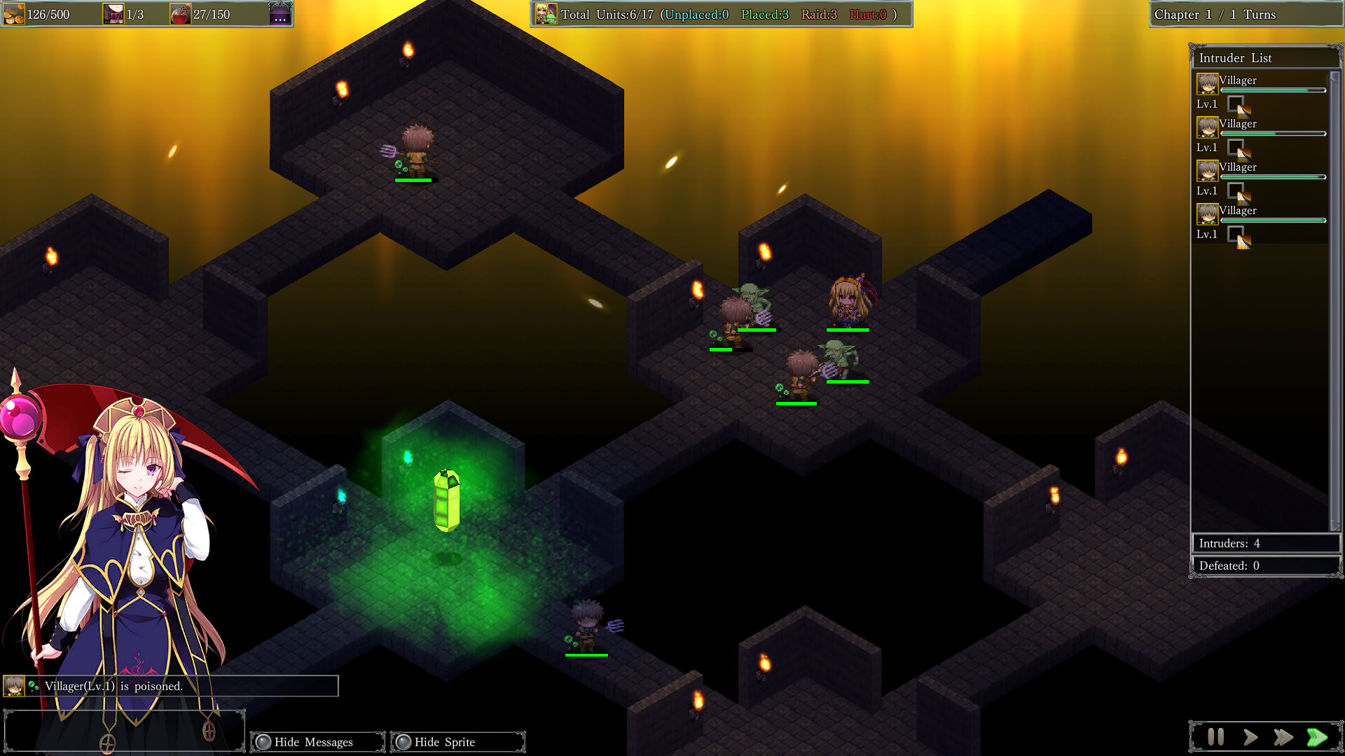 The Goddess of Chaos has reincarnated you as a Demon Lord in another world. Your mission is to lead the Forces of Chaos to victory over the Forces of Order. While your initial army consists of just a few goblins, you can grow your forces by employing even deadlier units such as ogres and daemons. As you defend your dungeon, you will encounter various heroines whom you can capture. Sway them into joining your cause and helping you protect your dungeon!