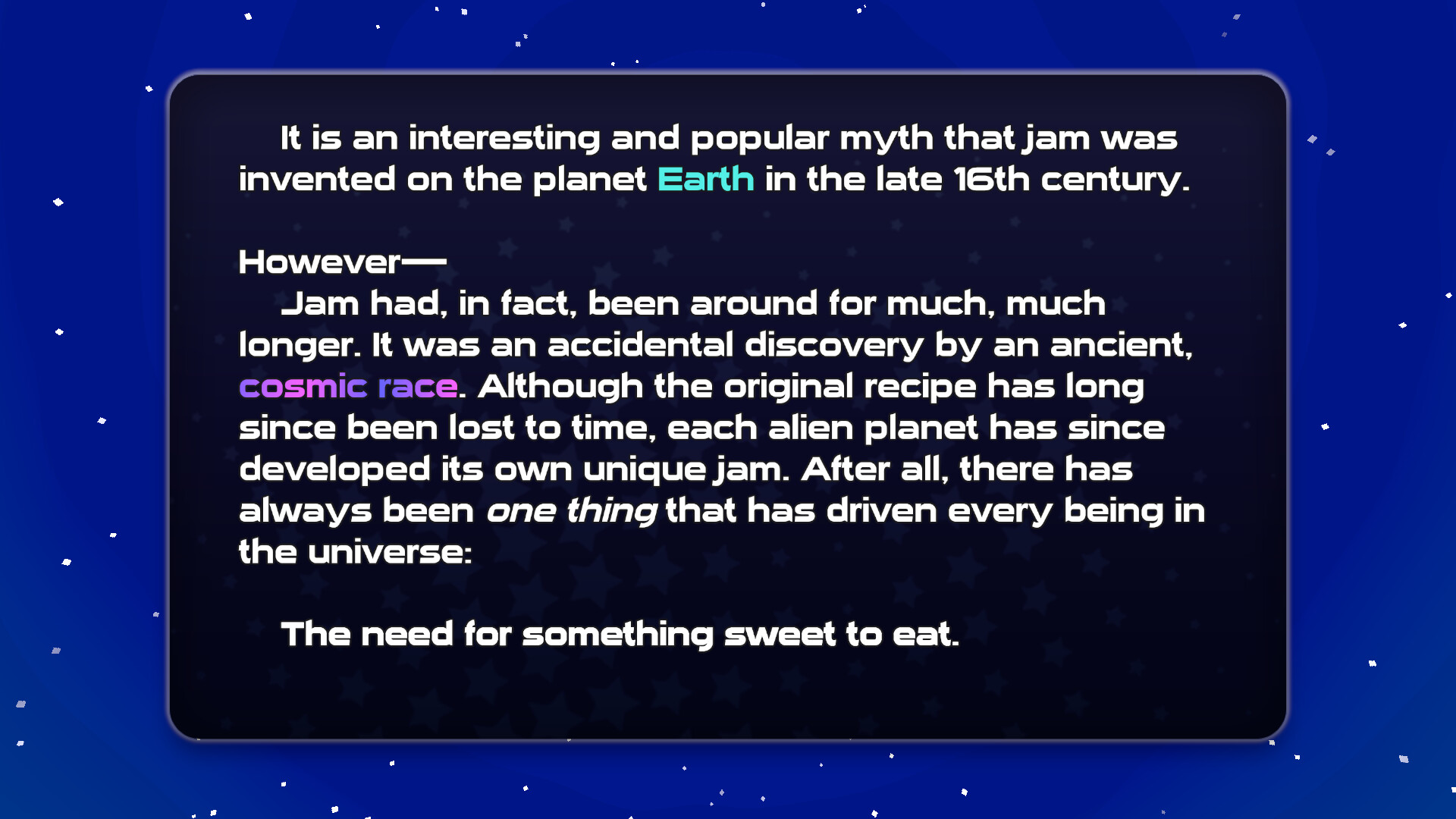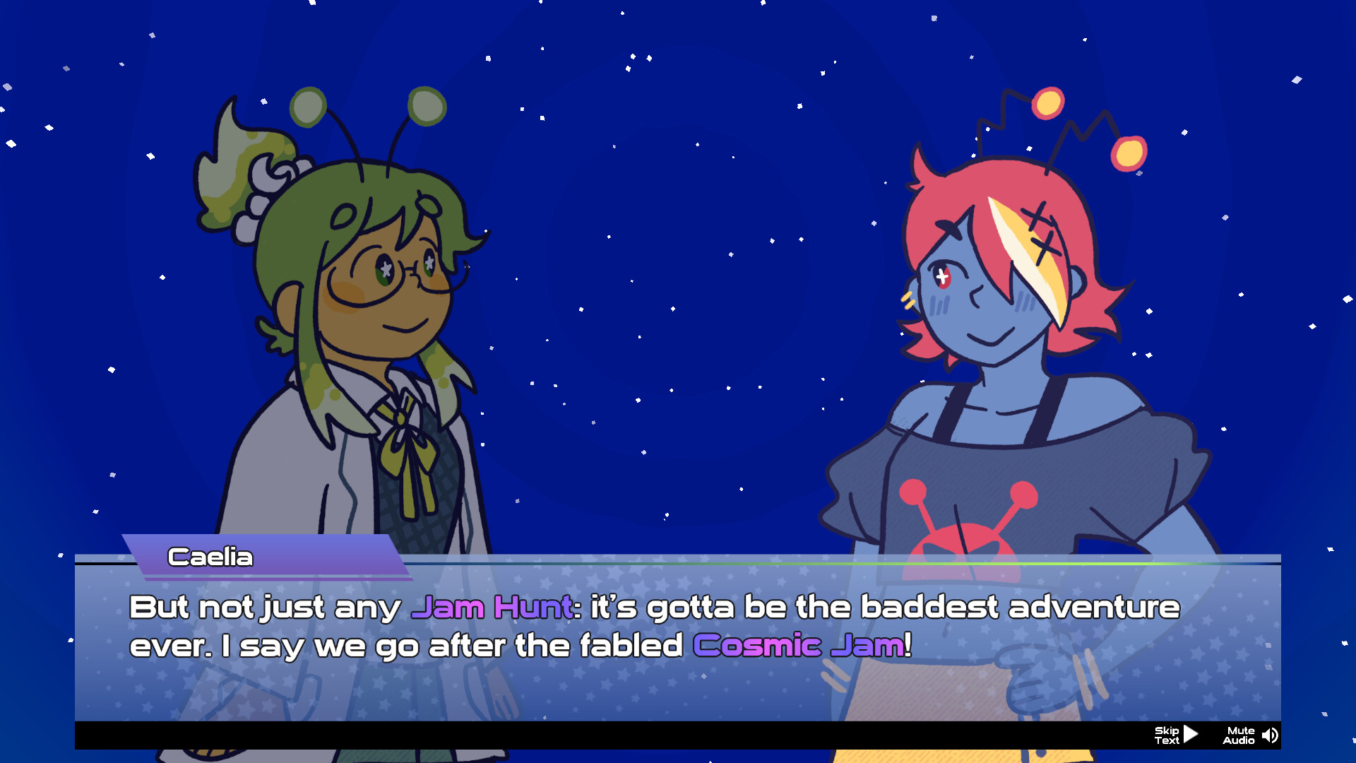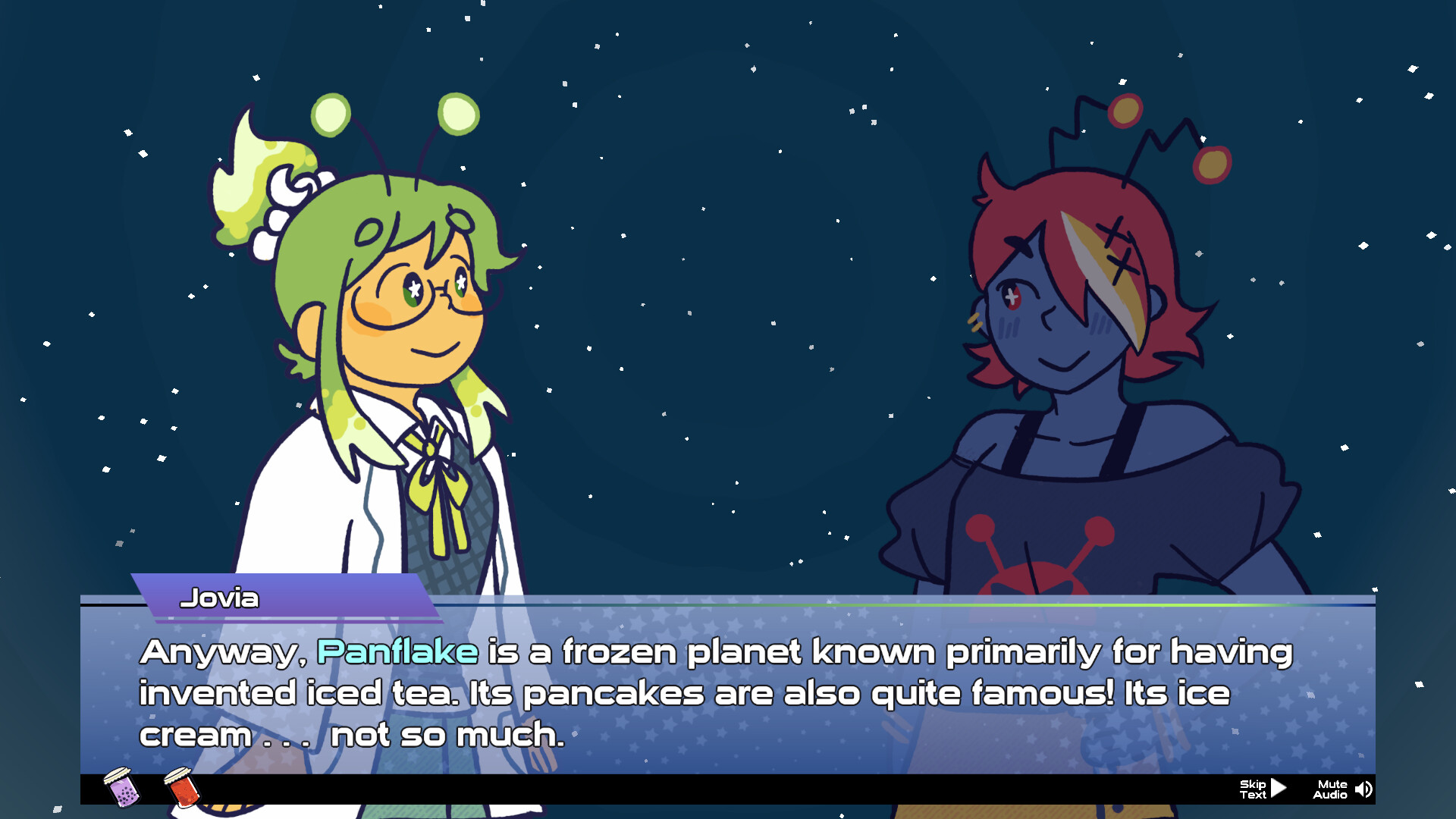 Startwatchers: The Search for Cosmic Jam is a visual novel about Jovia and Caelia, two alien best friends, and their roadtrip across the the galaxy all in search of the tastiest jam imaginable.