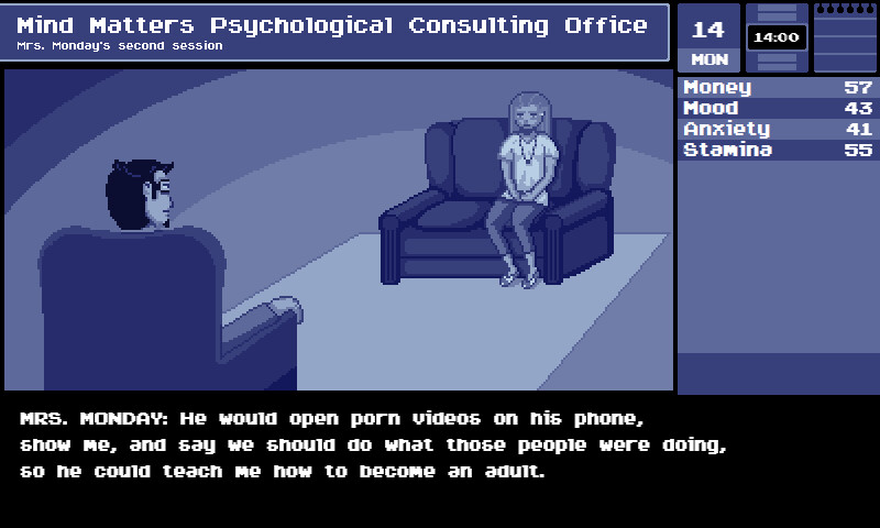 The game tells the story of a newbie therapist who needs to prove himself to his boss in order to move forward in his career. But while he's doing his best to take care of his patients' mental health, his real challenge is taking care of himself.