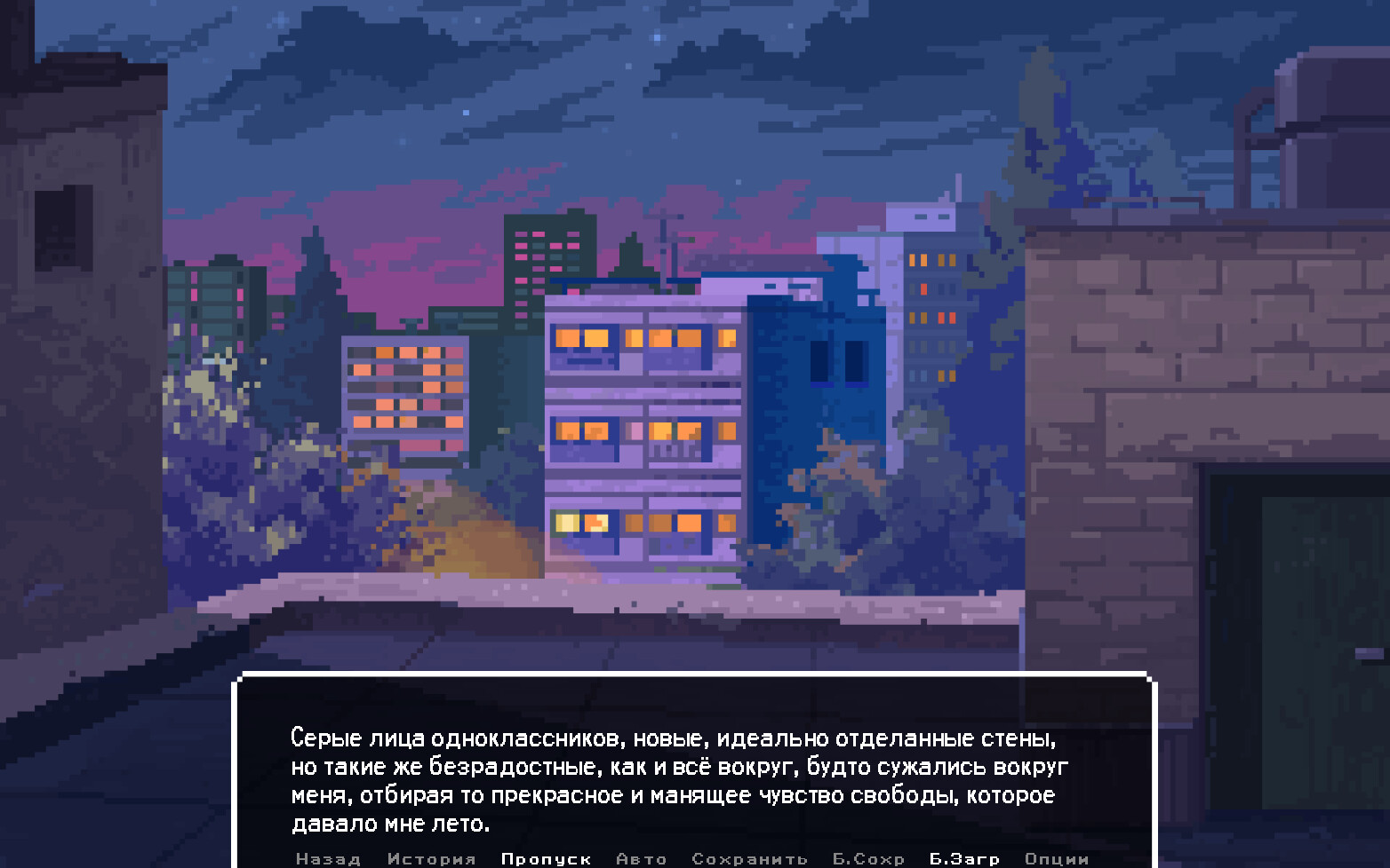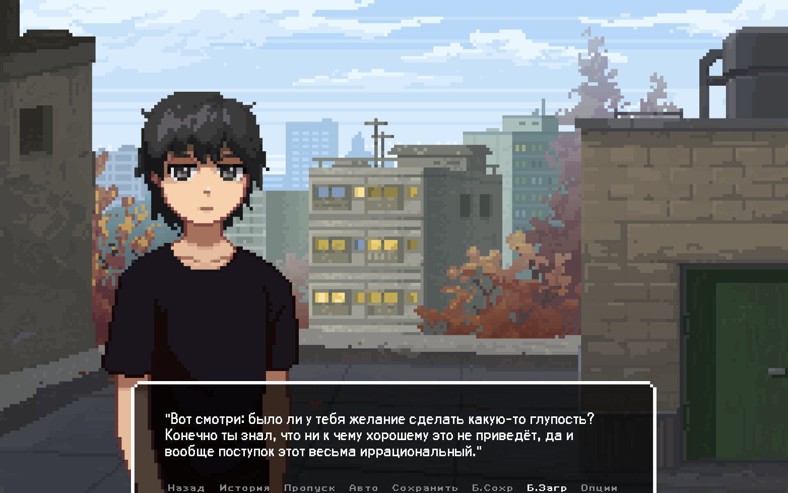 The story of a teenager who faces various difficulties trying to understand how this treacherous life is arranged. Why do people do certain things? What is the value of life? Should we discuss these issues with a mysterious friend on the empty roof of a multi-storey building? itch.io]