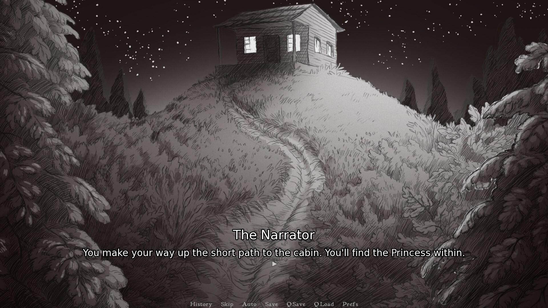You're on a path in the woods, and at the end of that path is a cabin. And in the basement of that cabin is a Princess.