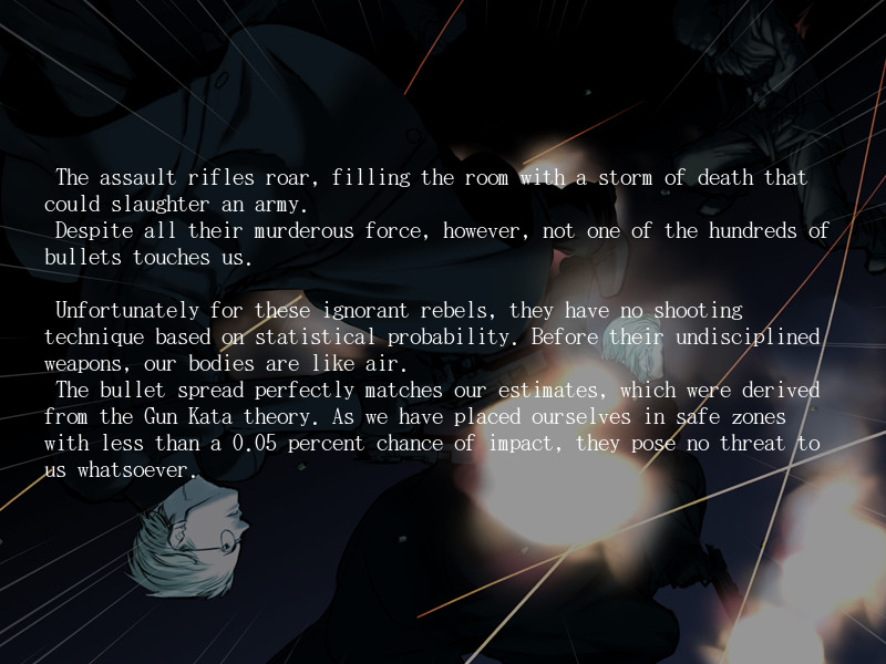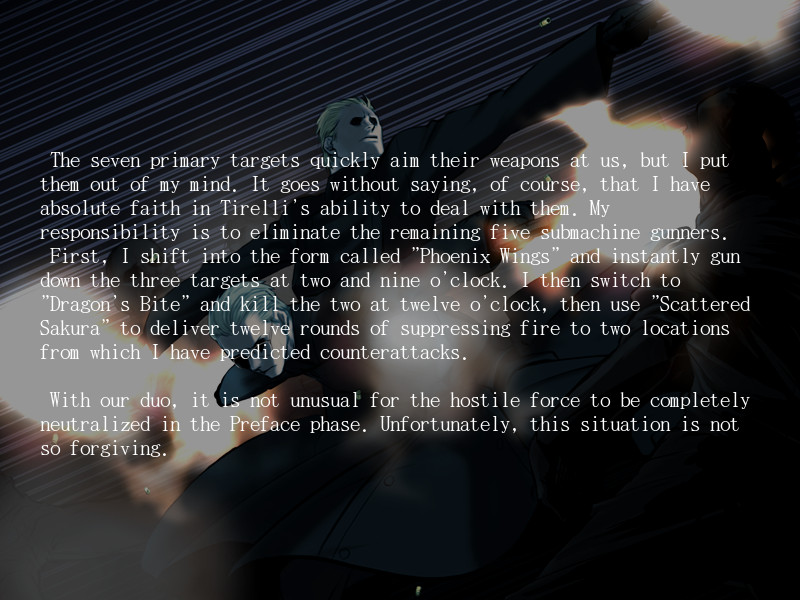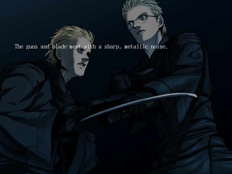 This is an Equilibrium fanfic by Urobuchi Gen, the author of Saya no Uta. No, really. (From TLWiki) The story of a duo of Grammaton Clerics, once a mentor and pupil, now partners.