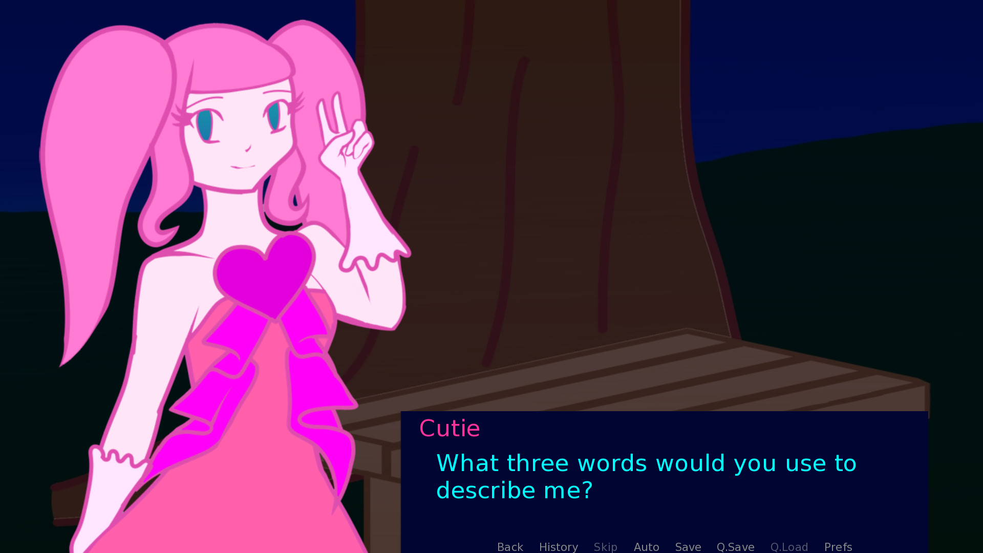 Cutie, Joy, and Edge are three girls you've had your eye on for a while. Tonight’s the night – you’re going to take one of them on a date! Tell them what they want to hear, and maybe things will go your way.