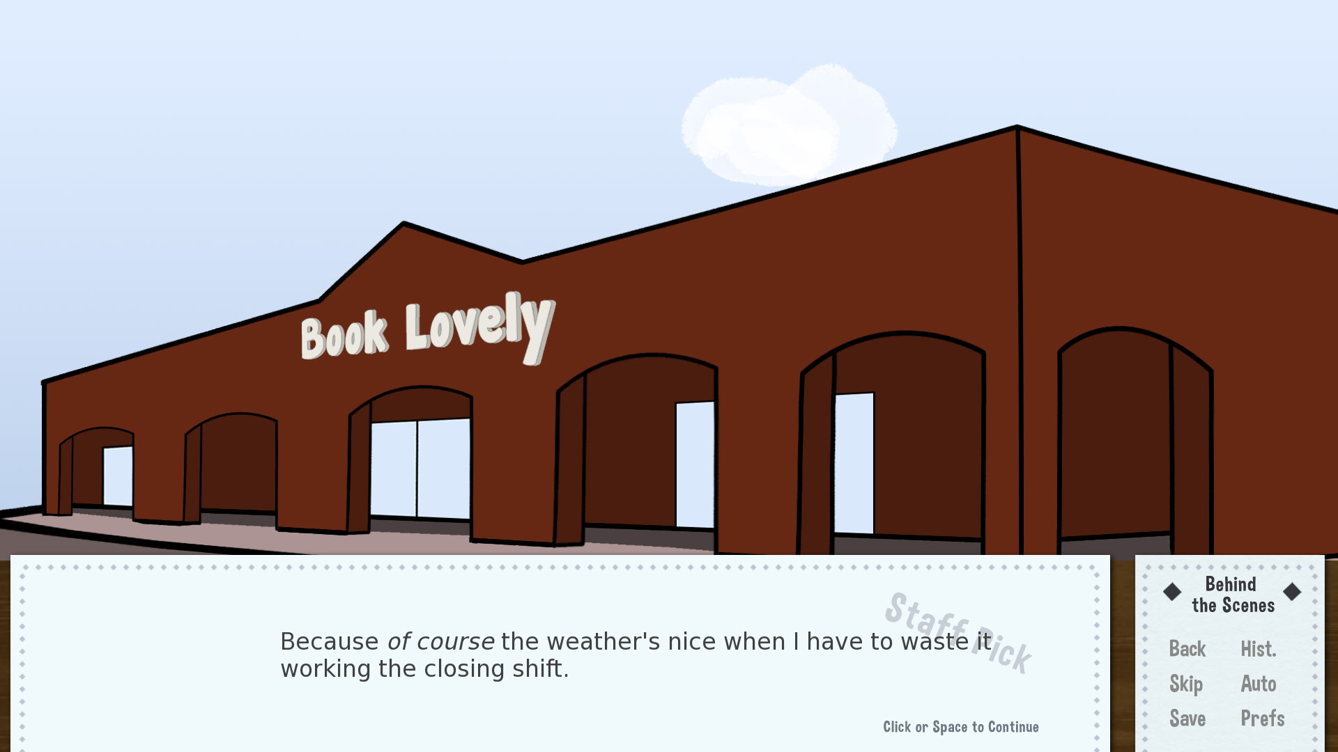 "What do you MEAN the books are out of place?" A bookstore employee, you and your coworkers are being plagued by your worst nightmare: books that don't seem to want to stay in their place on the shelves. What could possibly be happening? Itch.io]