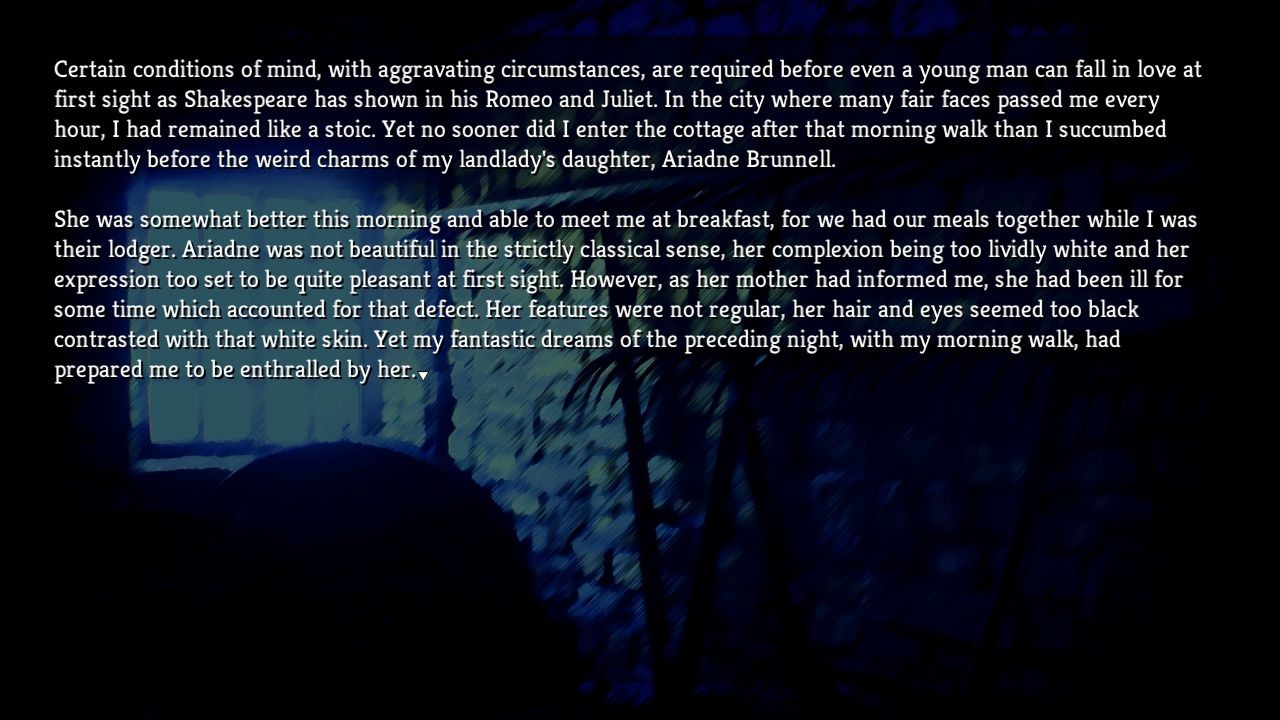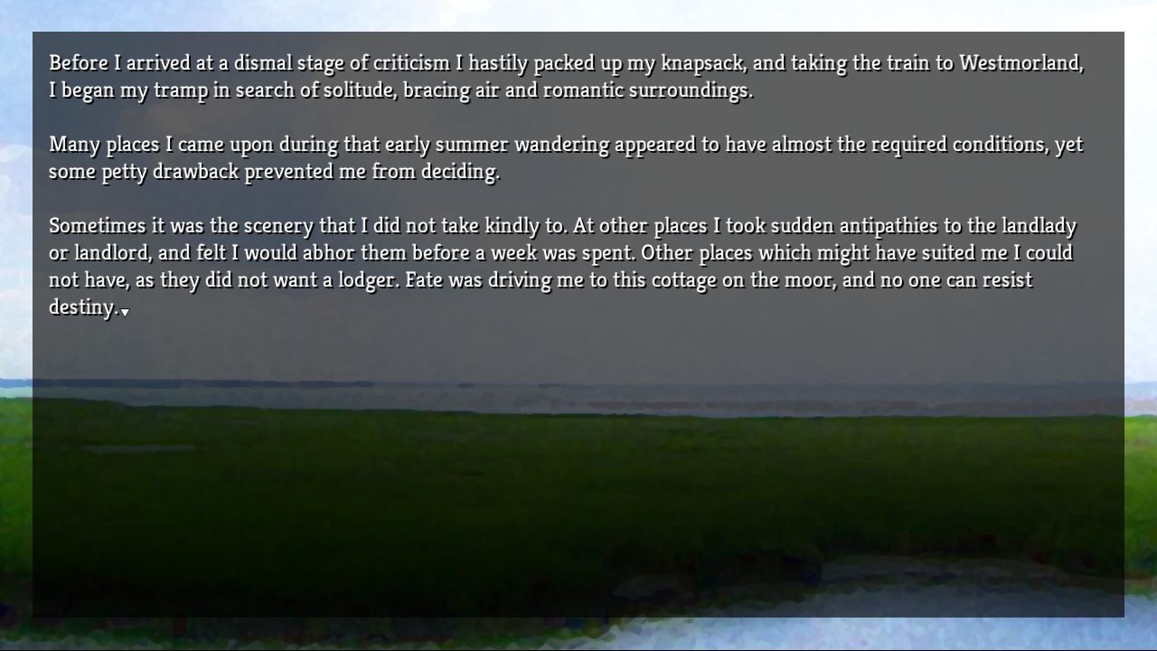 Cottage on the Moor tells the tale of a young writer on a trip to freshen his mind. Wandering a salt marsh far from civilization, he stumbles upon a small cottage inhabited by a middle-aged woman and her daughter. It seems he has found something more than just inspiration for his next story.