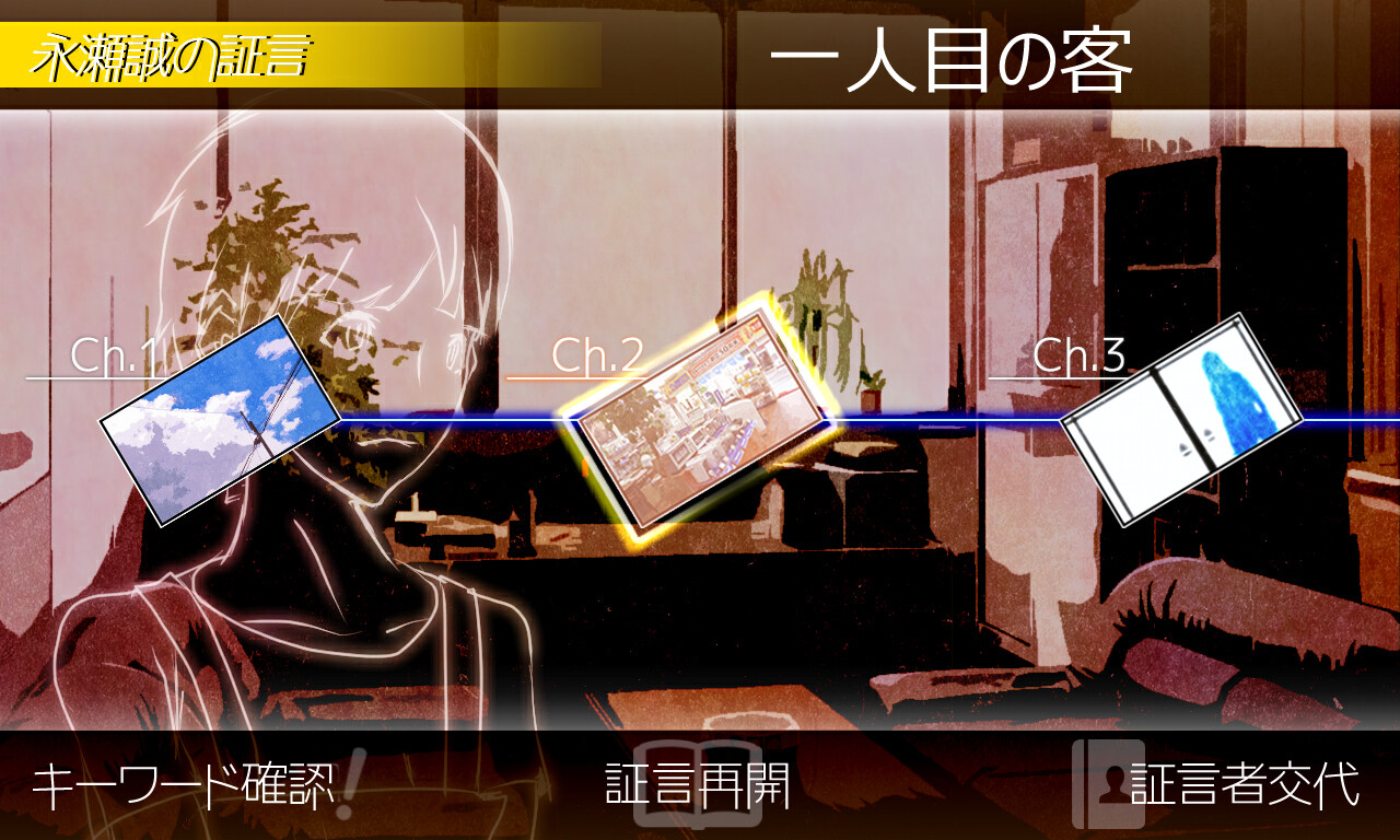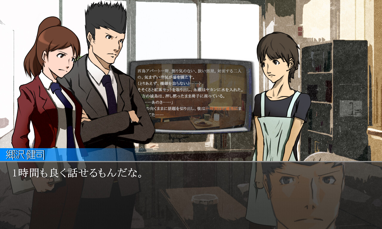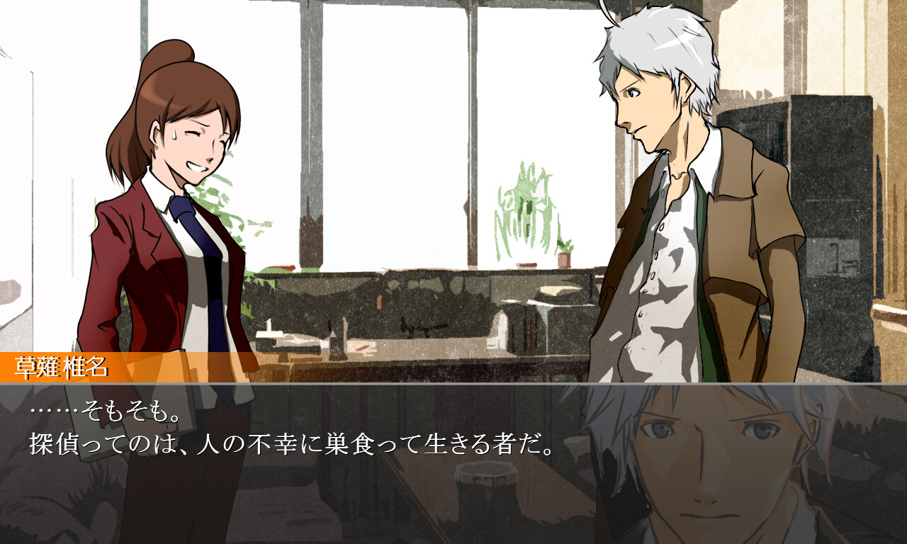 "Armchair Detective" is an interactive visual mystery novel. The player takes the role of "Mirai Machina," assistant detective of "Sina Kusanagi".