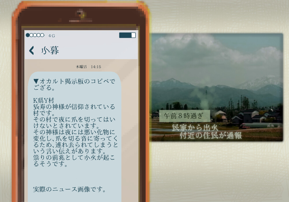 The protagonist, Furukawa Inosuke, is staying in 'Yonaga Village' for a few days as part of his thesis research. In that village, there existed an ominous legend about the deity of longevity the villagers worship: 'Yonaga-sama'.