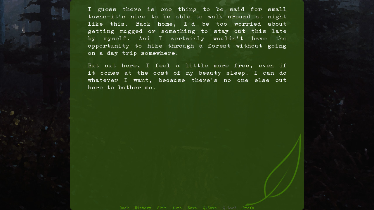 David's life isn't going quite like he imagined it would. The only place he could find work after college turned out to be an isolated small town, and the stress of his new job combined with the unfamiliarity of his surroundings is giving him trouble sleeping. One restless night, he takes a walk through the nearby forest and meets Ron, a cheerful stranger who's sympathetic to his problems. But a gap in his memories the next morning makes him wonder whether their encounter was only a dream.