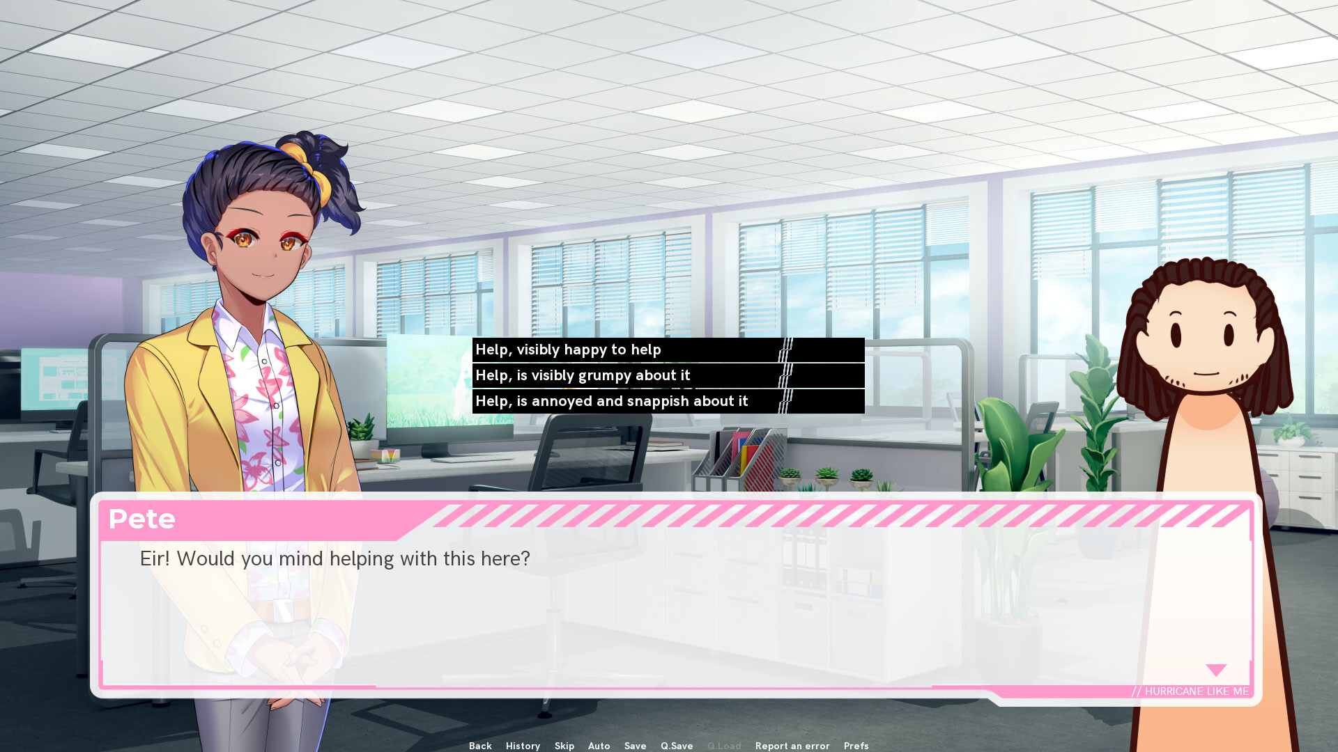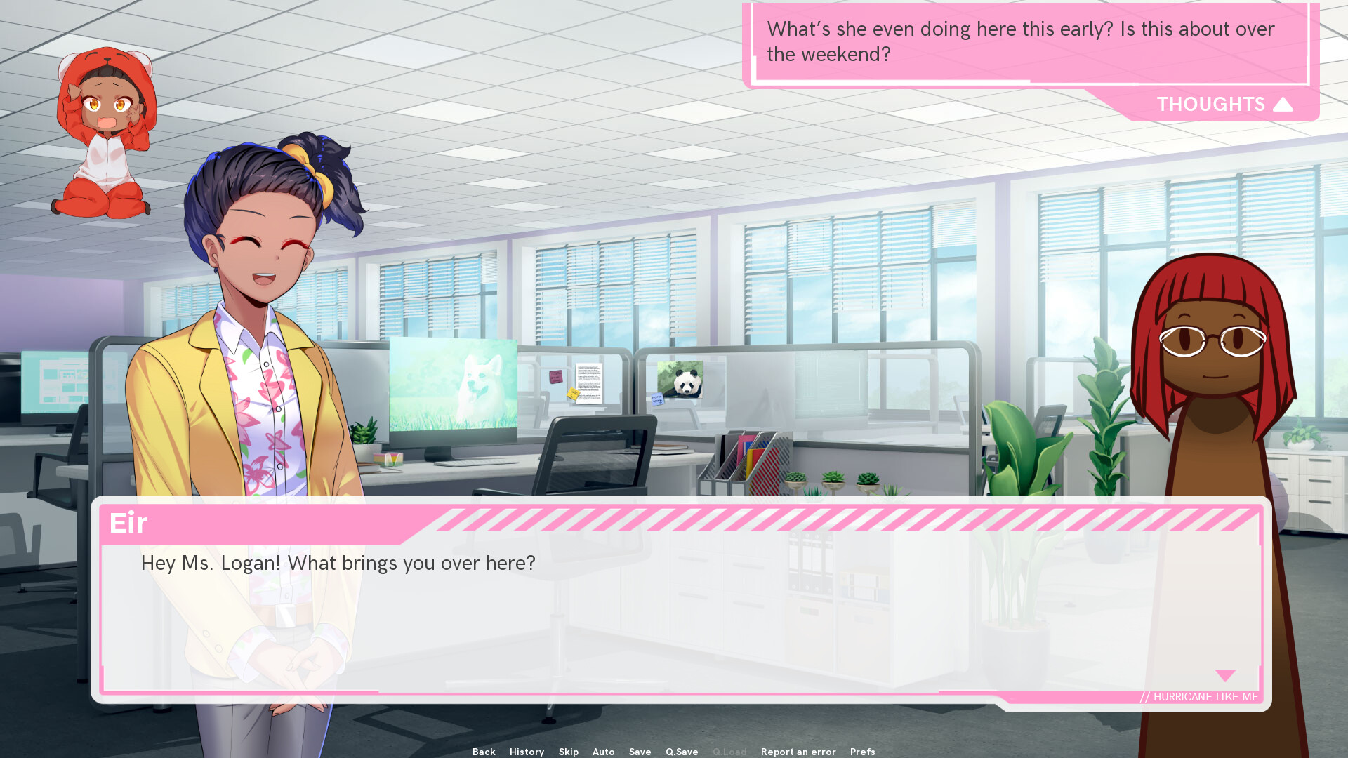 Its a slice of life short game about a girl named Eir who is as I put it a hot mess masquerading as a human being. She's an executive art director who is great at running other peoples lives and managing projects but is terrible at her own life. The games plot centers around her losing her bag on a New York City train and the boy who finds it and is trying to reunite her with her things and the stumbling blocks they face.
