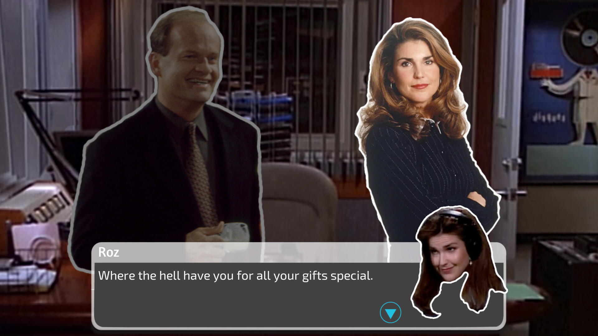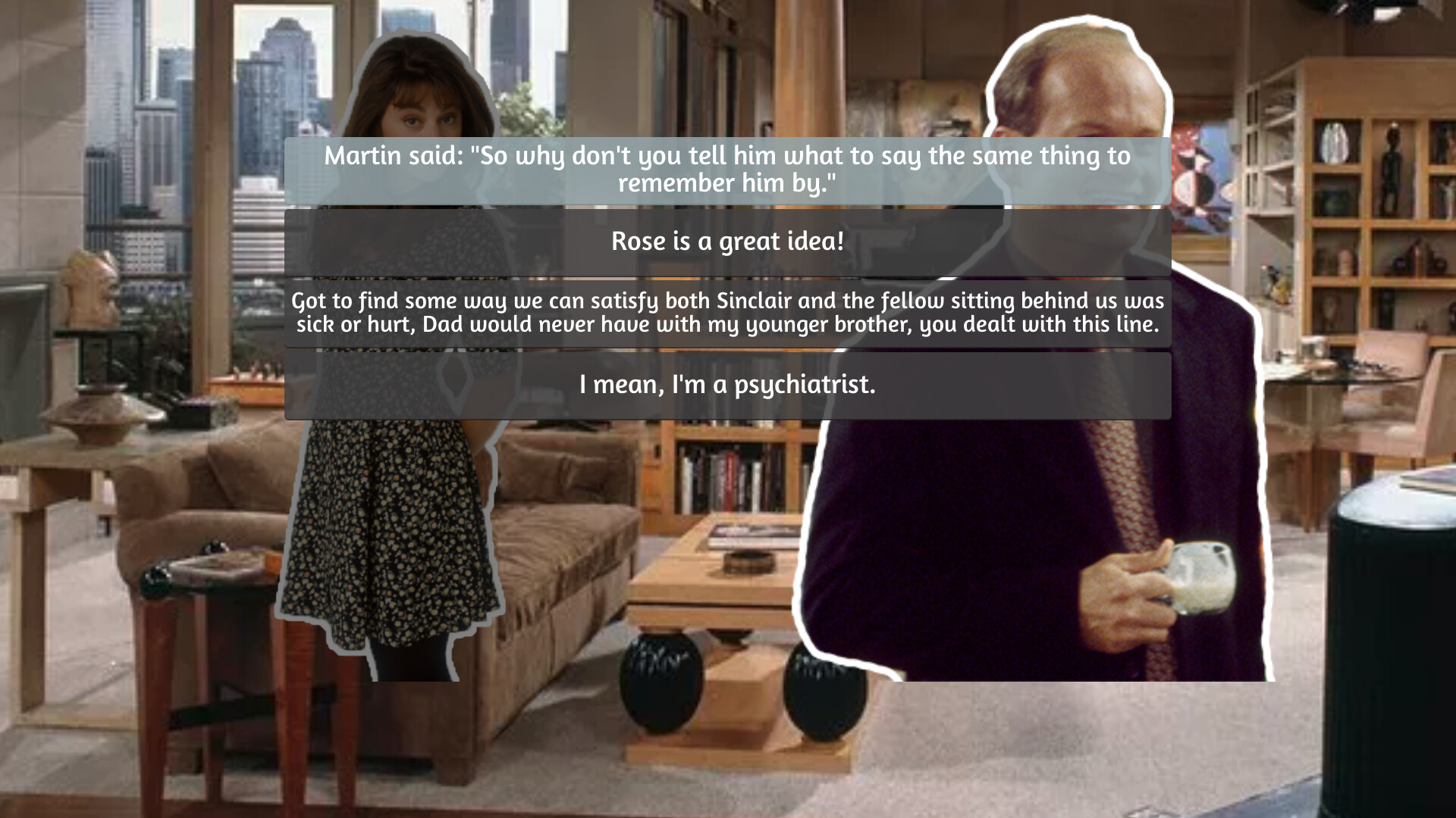 Do you miss the hit sitcom Frasier (1993 - 2004)? Do you wish that you could live in that weird, sterile version of Seattle alongside all of your old friends, like Niles, Martin, Daphne, and Roz? Using cutting edge Markov Chain technology, we have created an infinite Frasier Episode creator just for you. Sit back, relax, and guide Frasier through a typical day at the studio, coffee shop, and ridiculously spacious apartment.