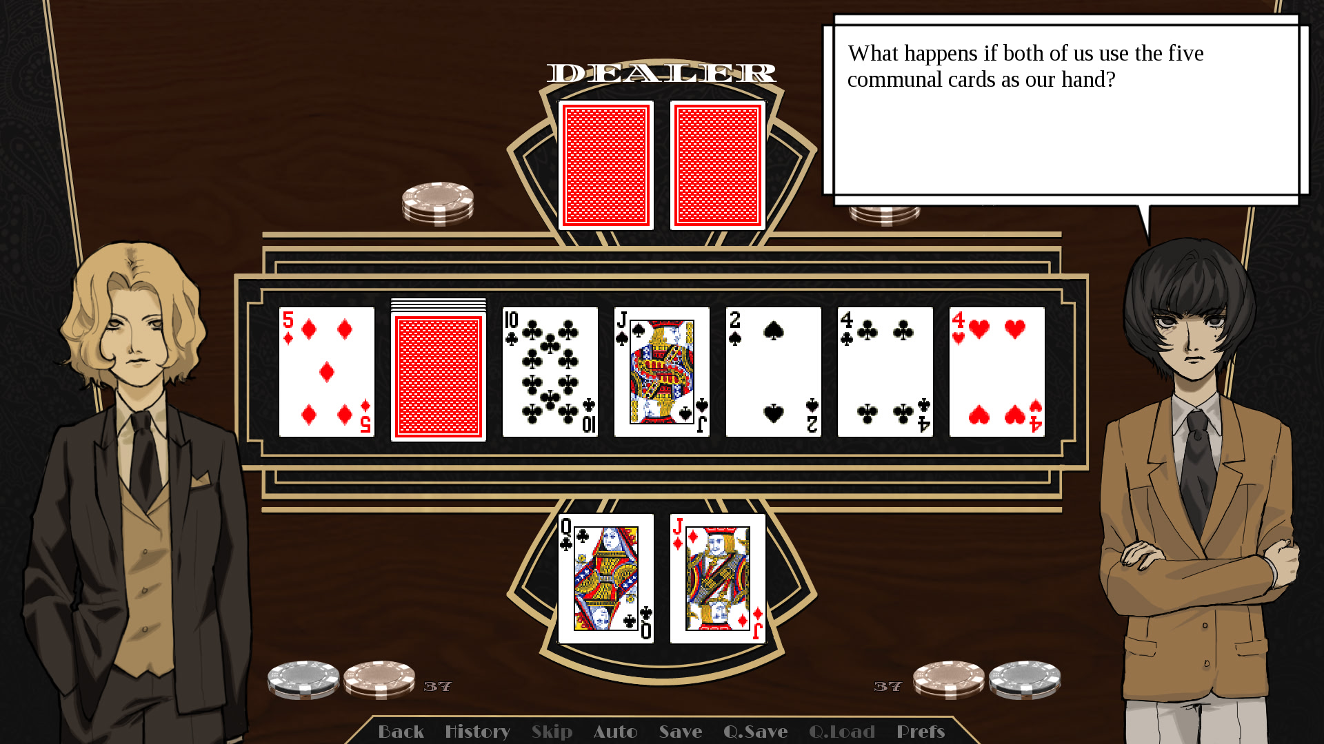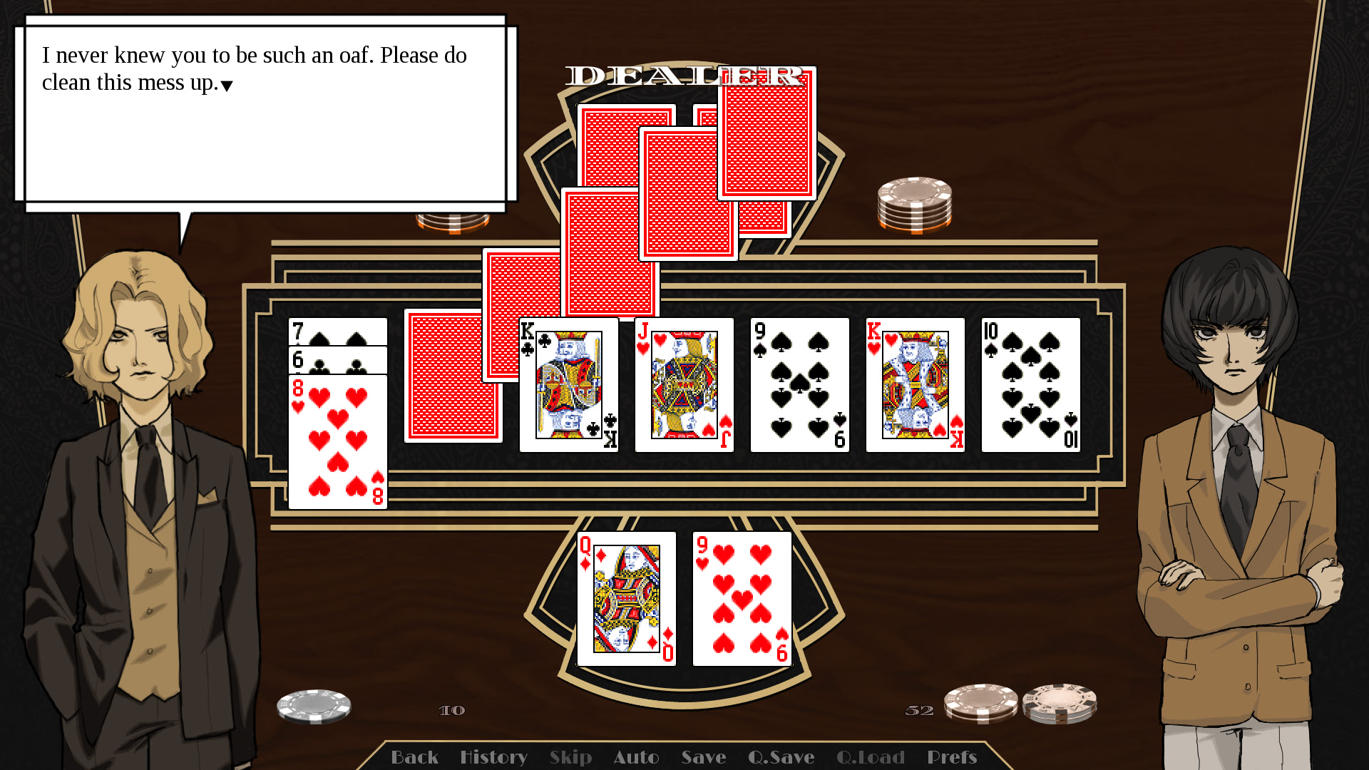 In the mid-1920's, two women take a train ride to Chicago while they try to repair their relationship over a game of poker. As layers of bluffs unfold, it becomes clear that the game is more than what it first appears to be. Itch.io]