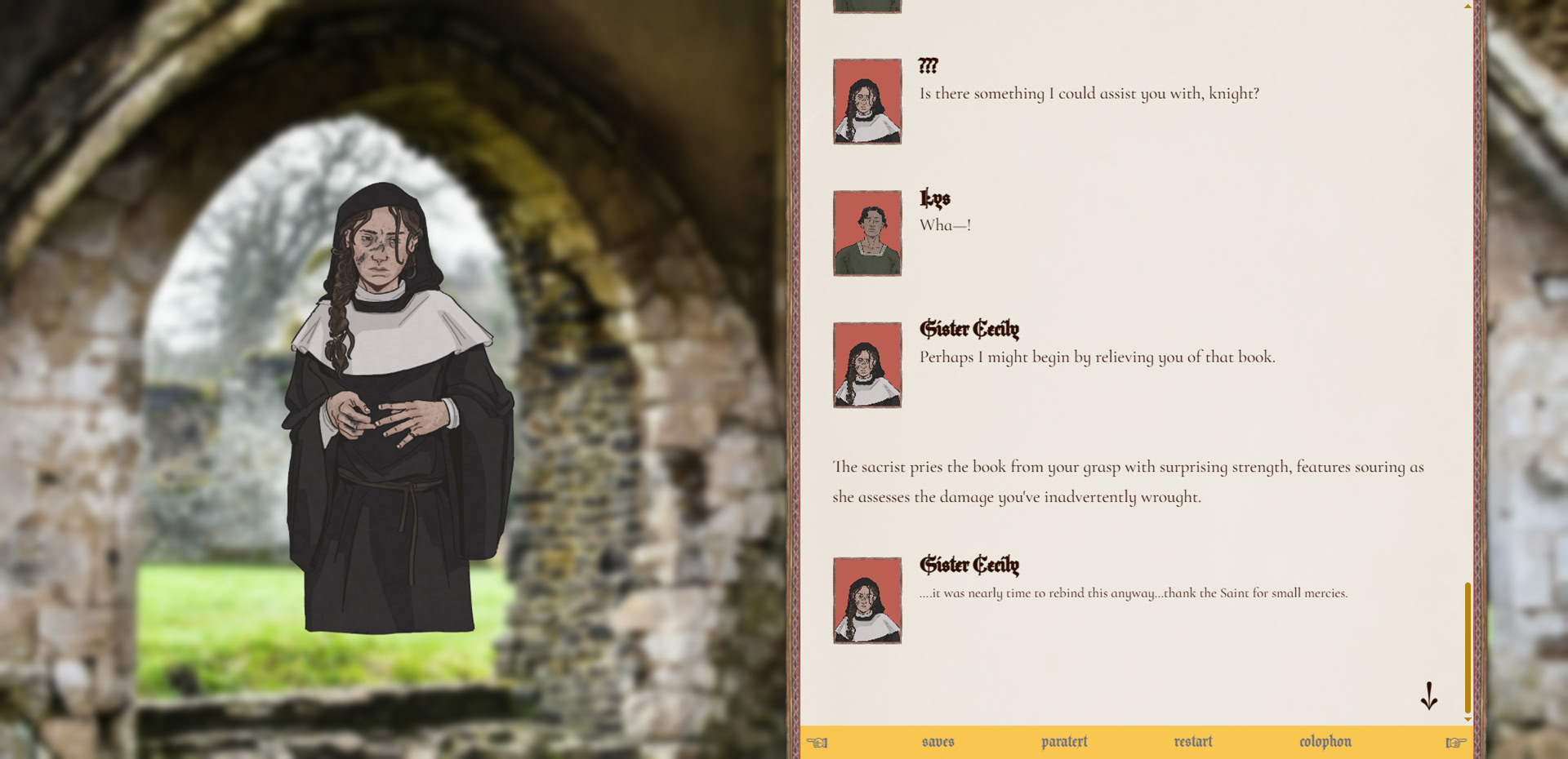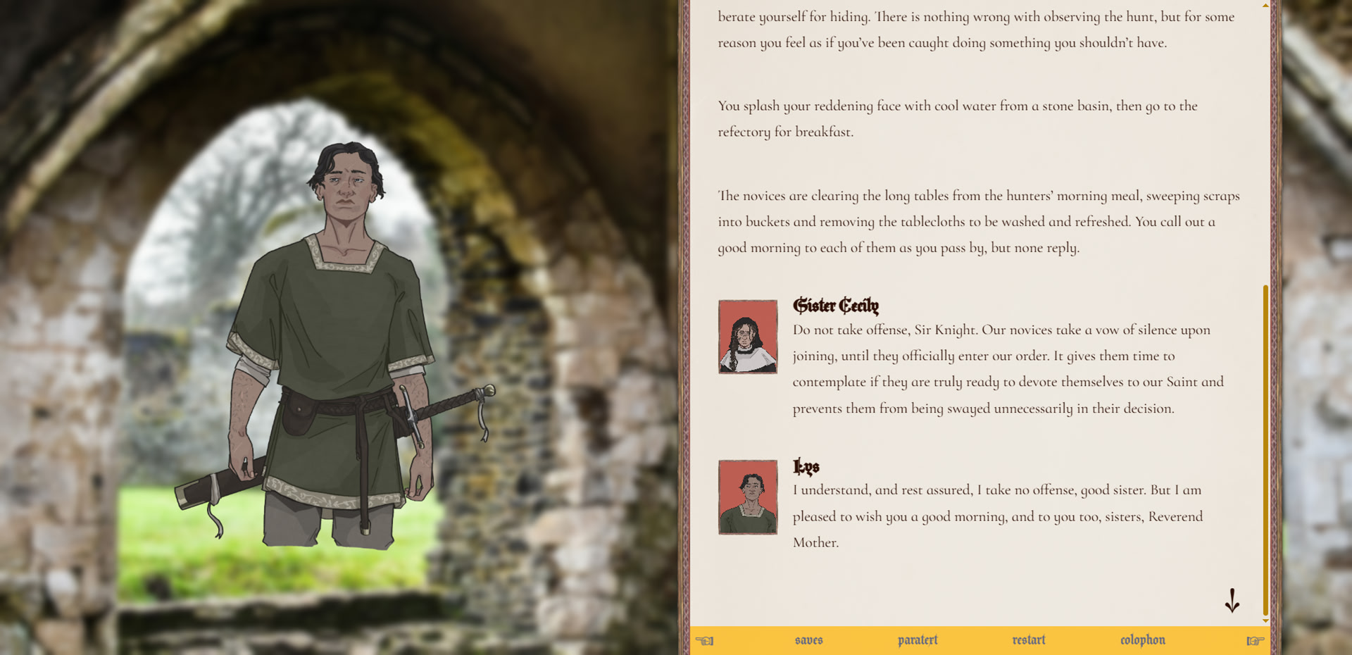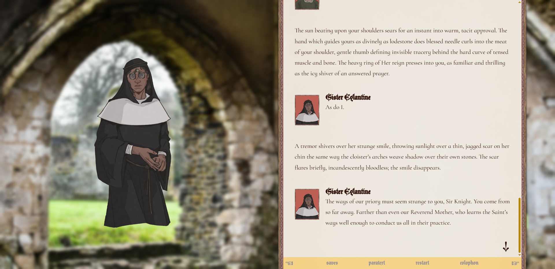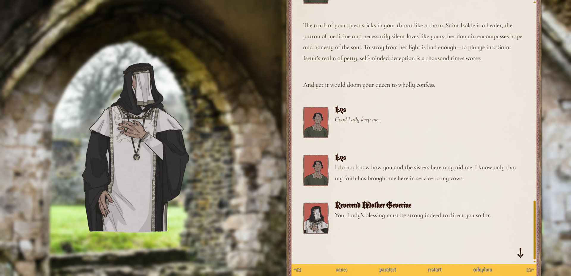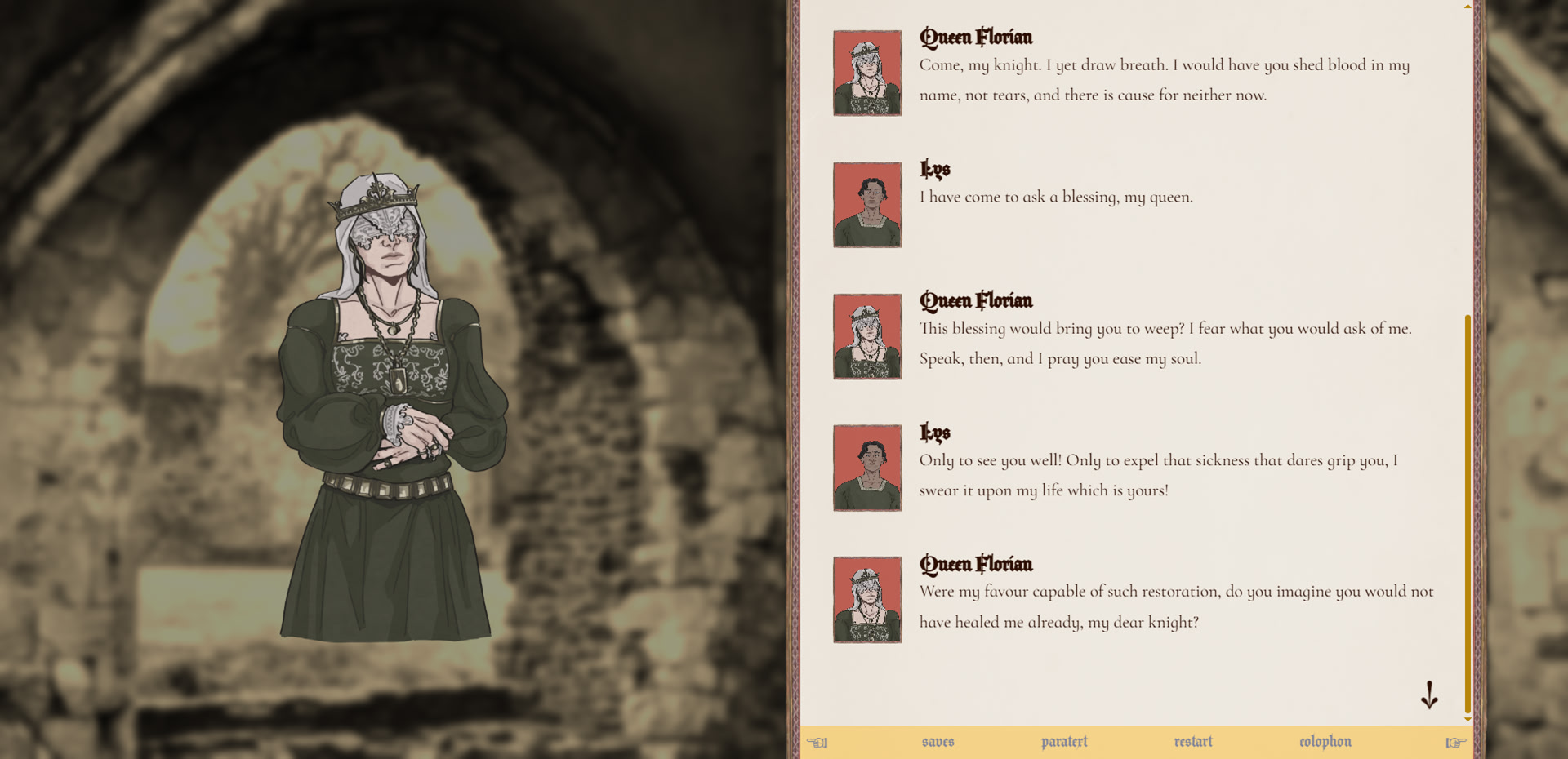 The beasts of our priory are noble. They know their own. How far would you go to save your queen? In sweltering lands far from home, a knight makes three choices. itch.io]
