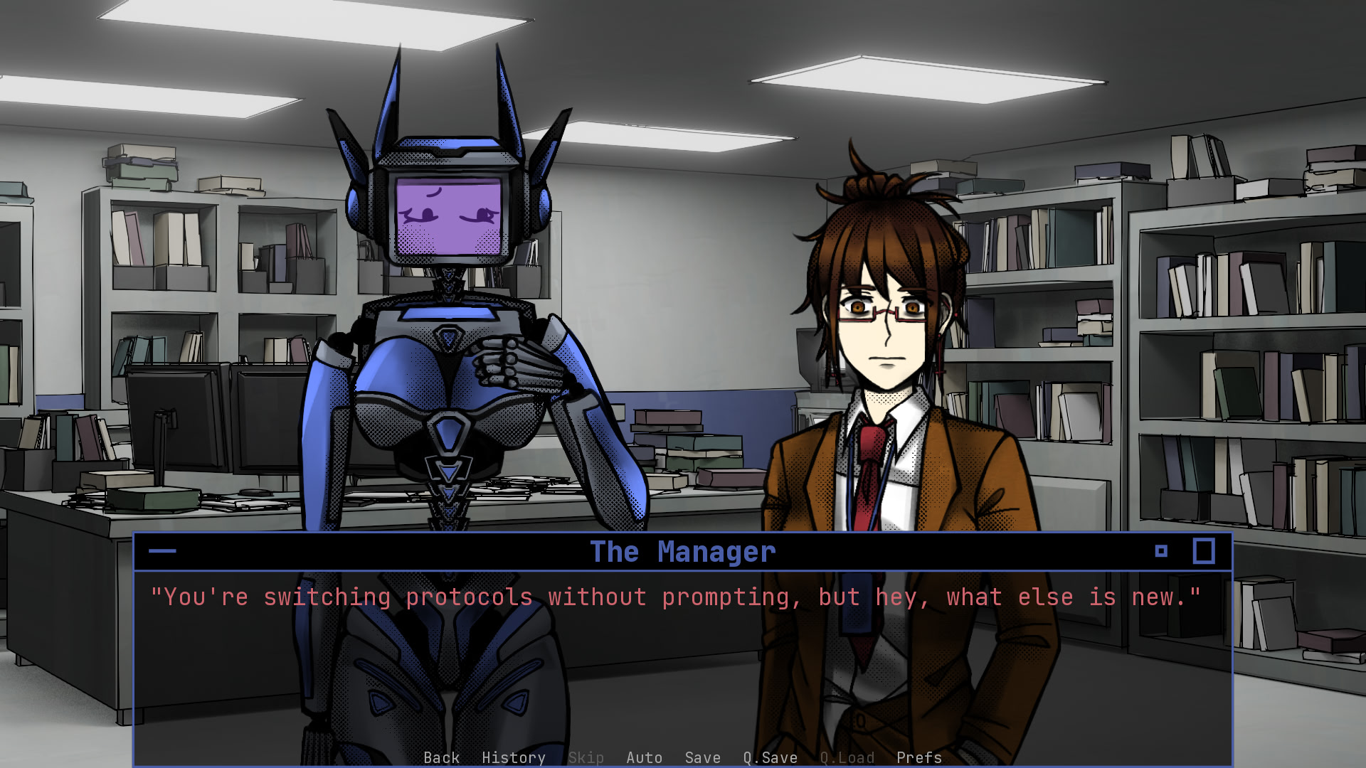 Two anomalous entities contained within a secret facility are in tension. Follow the Robot as she struggles to obey the Manager's new orders: handling the Flesh, a stubborn and unserious shape-shifting monster of gore. itch.io]