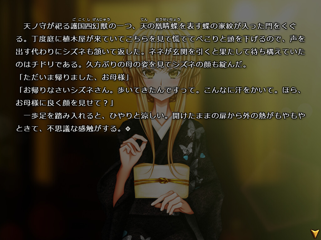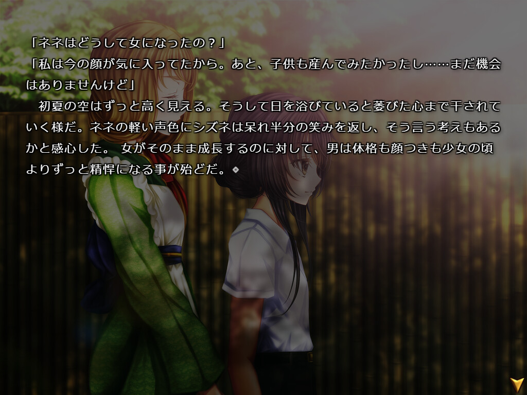 The nation of Itaru is shielded by four legendary beasts representing the sky, the earth, the day and the night. Here people are given birth as a girl with no exceptions, and later choose to become either man or a woman. This is a story of siblings who shoulder a fate to see the truth... DLsite]