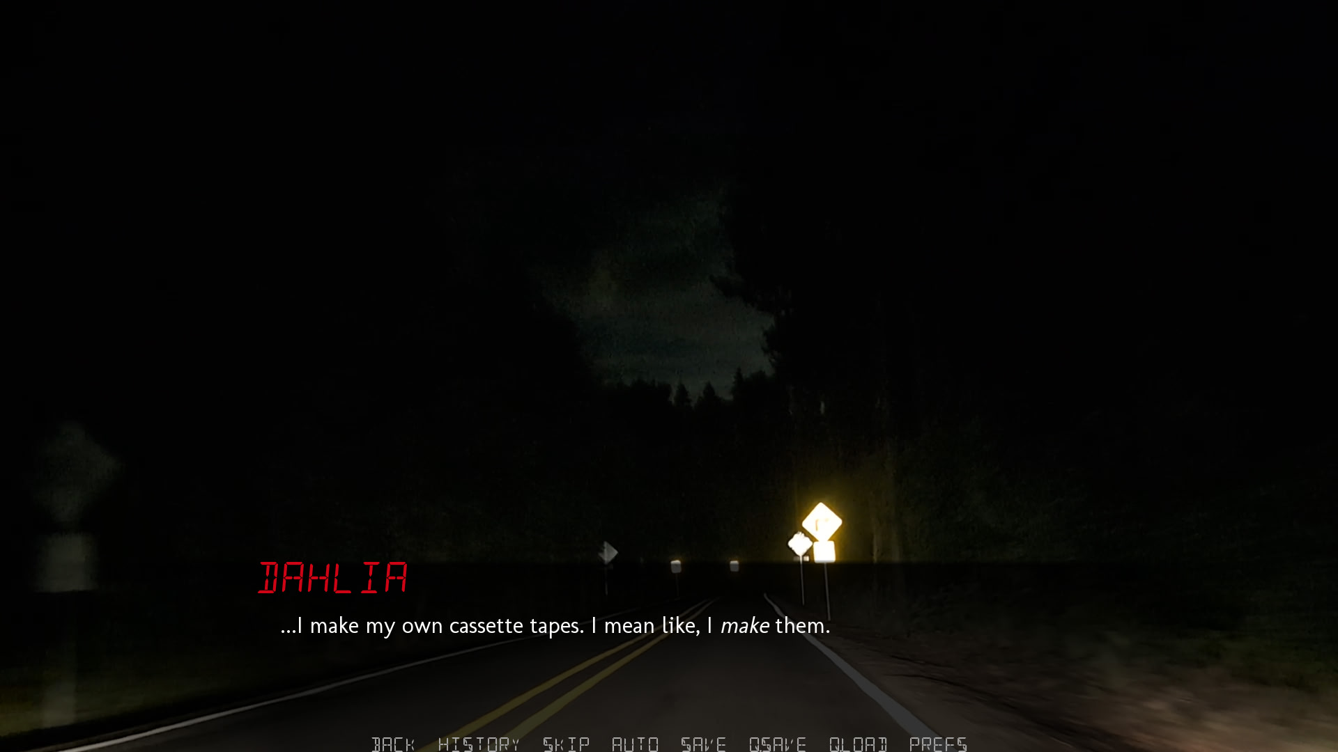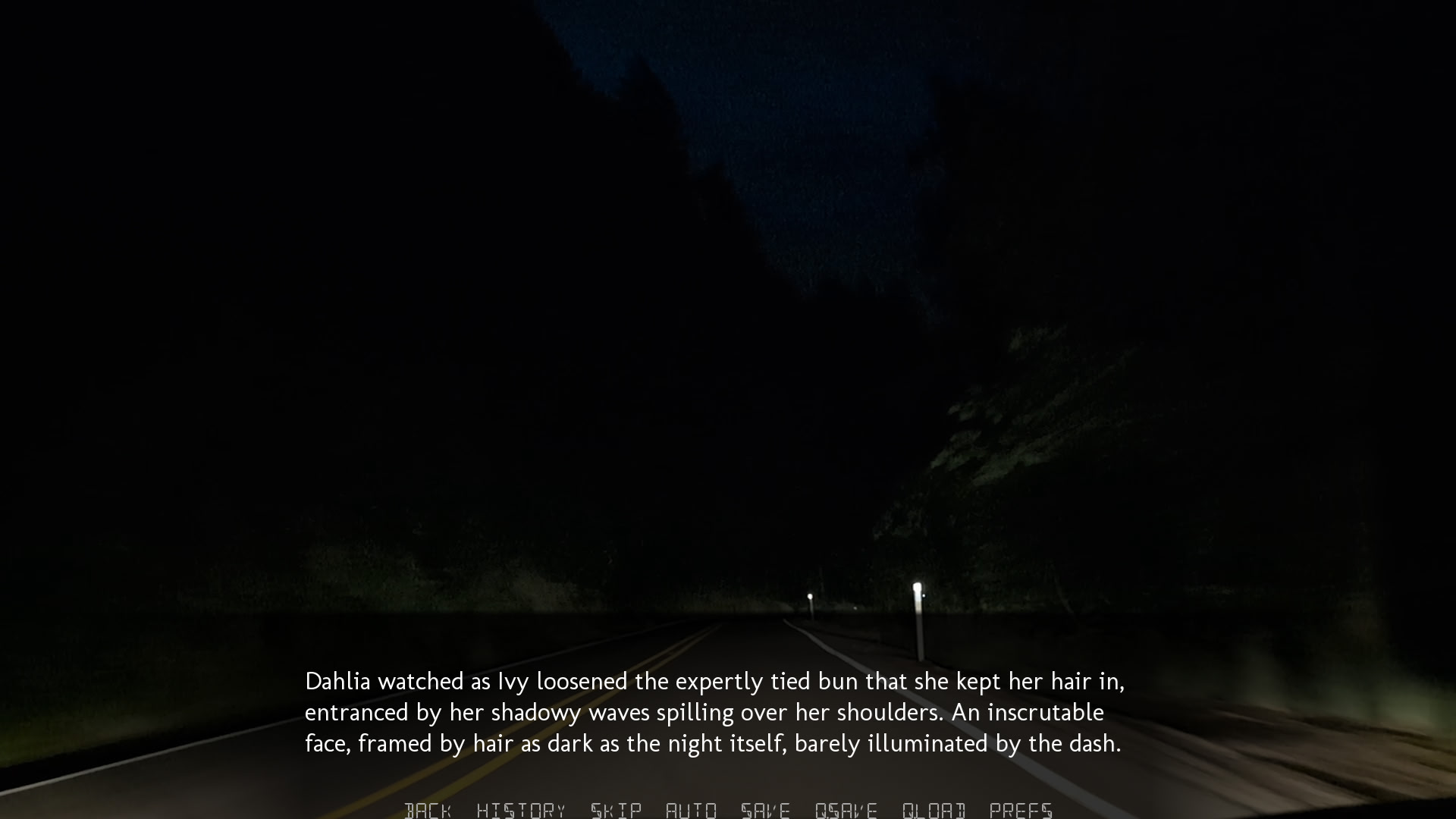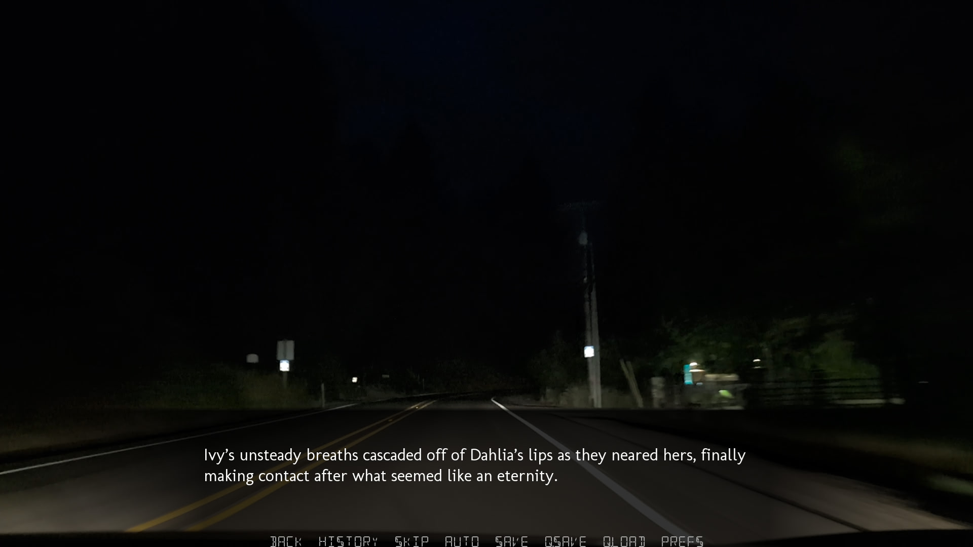 A 5000 word linear visual novel (kinetic novel???) about giving a ride home to a coworker. No sprites. Takes maybe 30 minutes, maybe more if you stop to listen to the music. A toxic yuri story about flawed perception told from the POV of a dashcam over the course of 9 weeks.