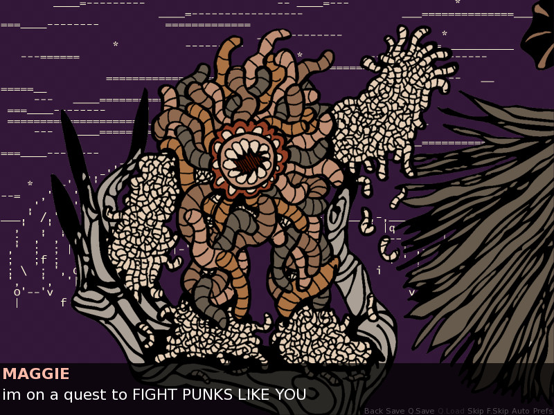 GENDERWRECKED is a post-apocalyptic genderpunk visual novel about traveling broken lands and kissing/fighting/talking to monsters in an attempt to learn the true meaning of a mysterious force called GENDER.
