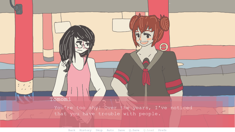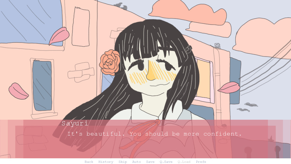 Play from Sayuri's point of view as she navigates difficult choices about romance and her life. The player will make choices that will teach Sayuri the meaning behind queer romances, shyness, trauma, bullying, demisexuality, family, and the words, "I love you."
