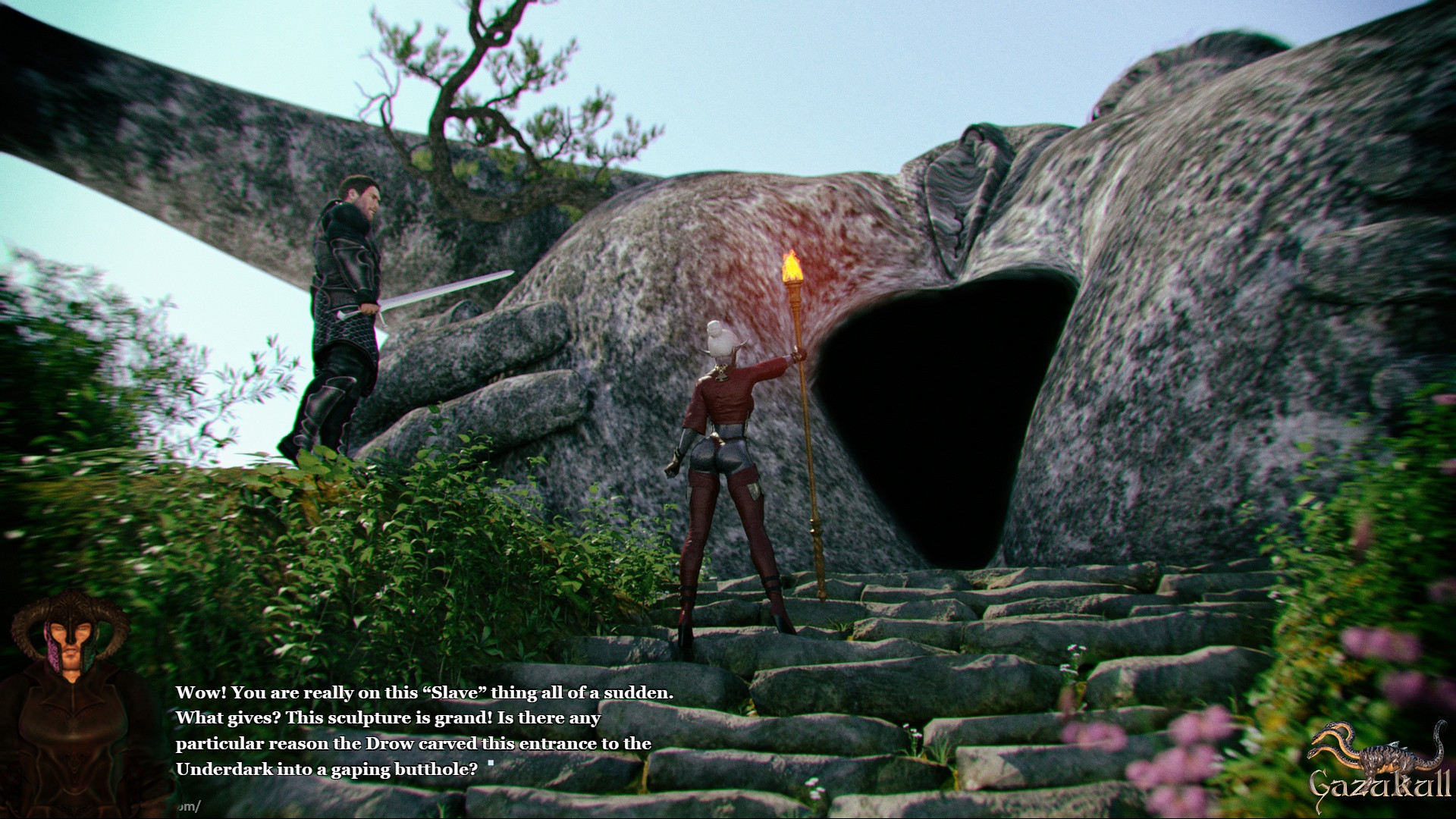 The capricious Drow rogue Alia D’Vir receives a mysterious missive from the Underdark, beckoning her back home. She travels with her slave back into the bowels of the world and embarks on an epic gangbang. Official site]