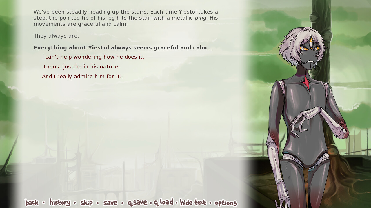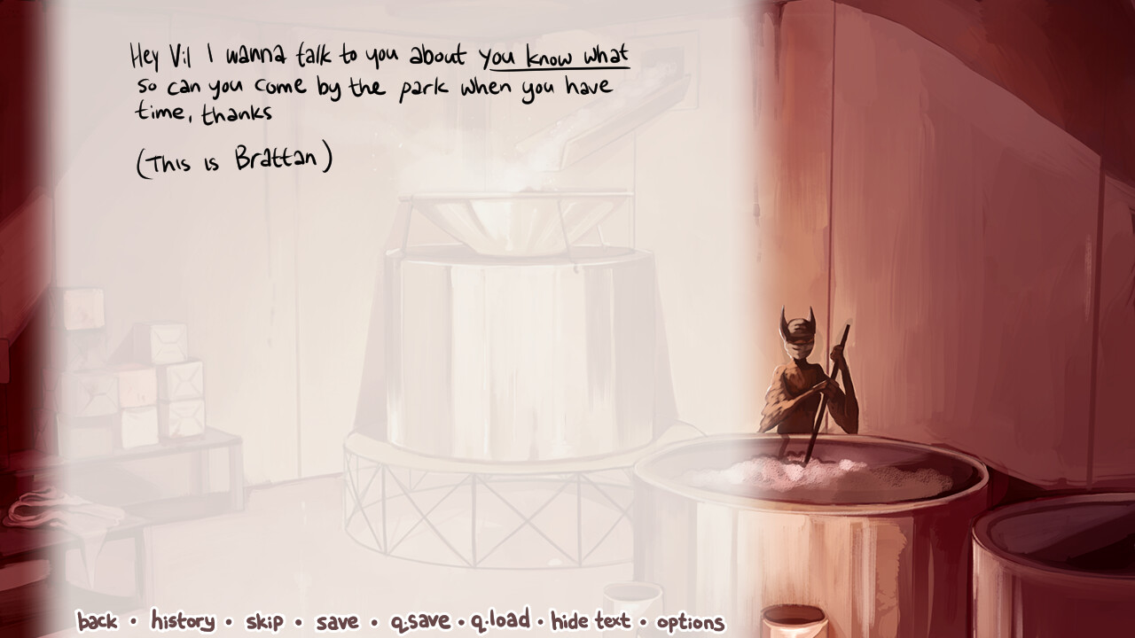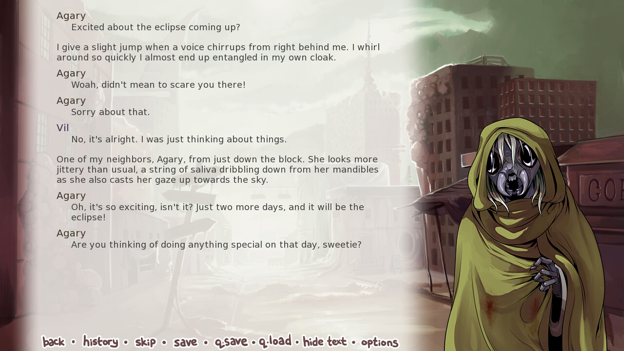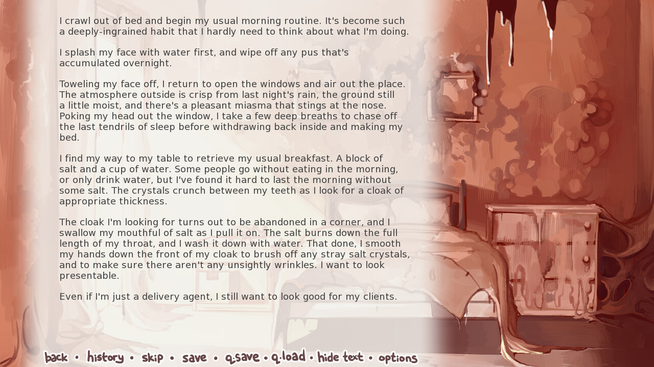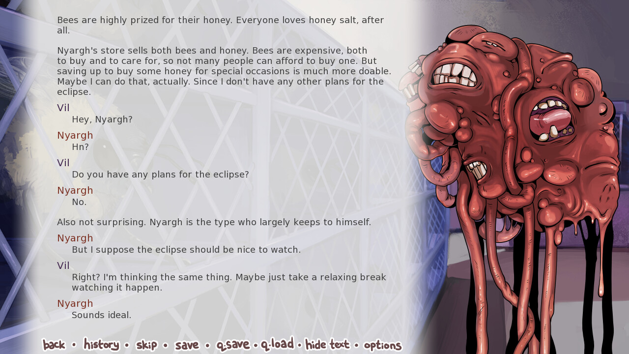Meeting in the Flesh is a free horror/romance visual novel. You play as Vil, the resident of a strange but friendly little city, encountering various people and getting the chance to court one of three different monstrous suitors. Though the game will include some body horror imagery, the game is a romance at its core, with a focus on getting to know and growing closer to your partner. It features romantic scenes that can be toggled between a PG-13 and R rating.