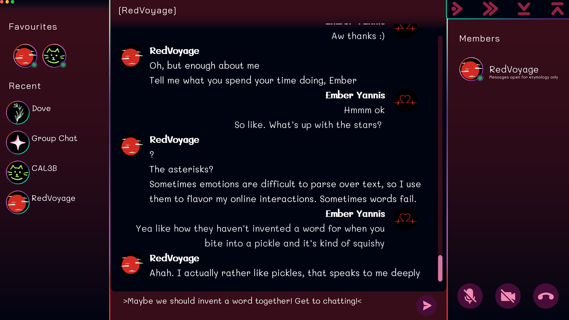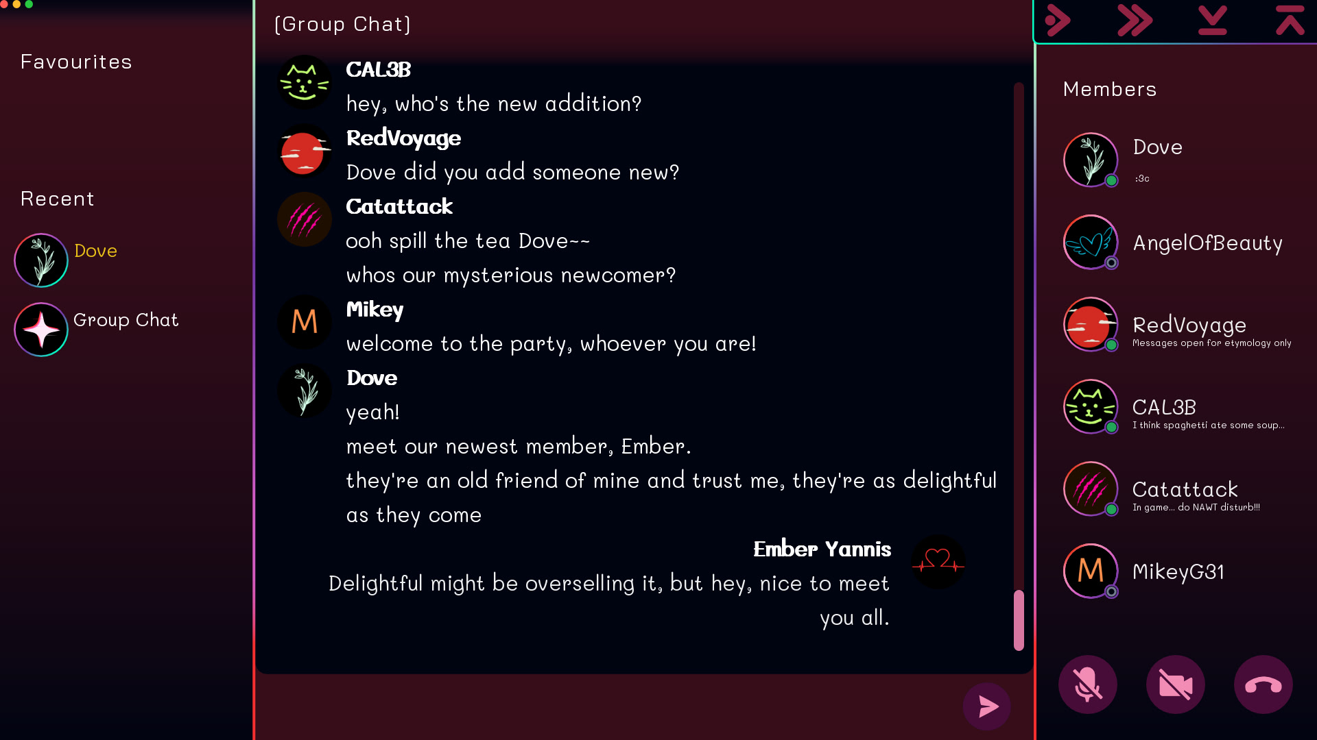 Your friend Dove invites you to a group chat to make some new friends. Everyone is so different but so friendly! They all seem so interested in you—too interested. Have fun navigating online relationships! (Or don't) itch.io]