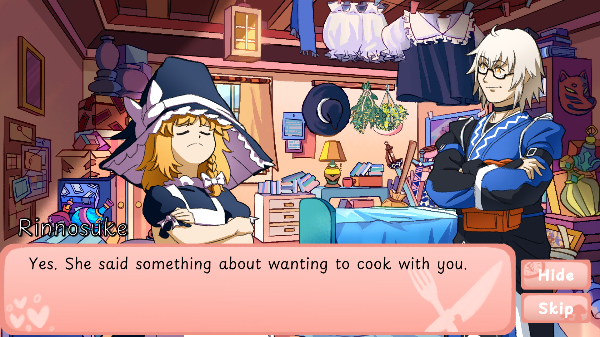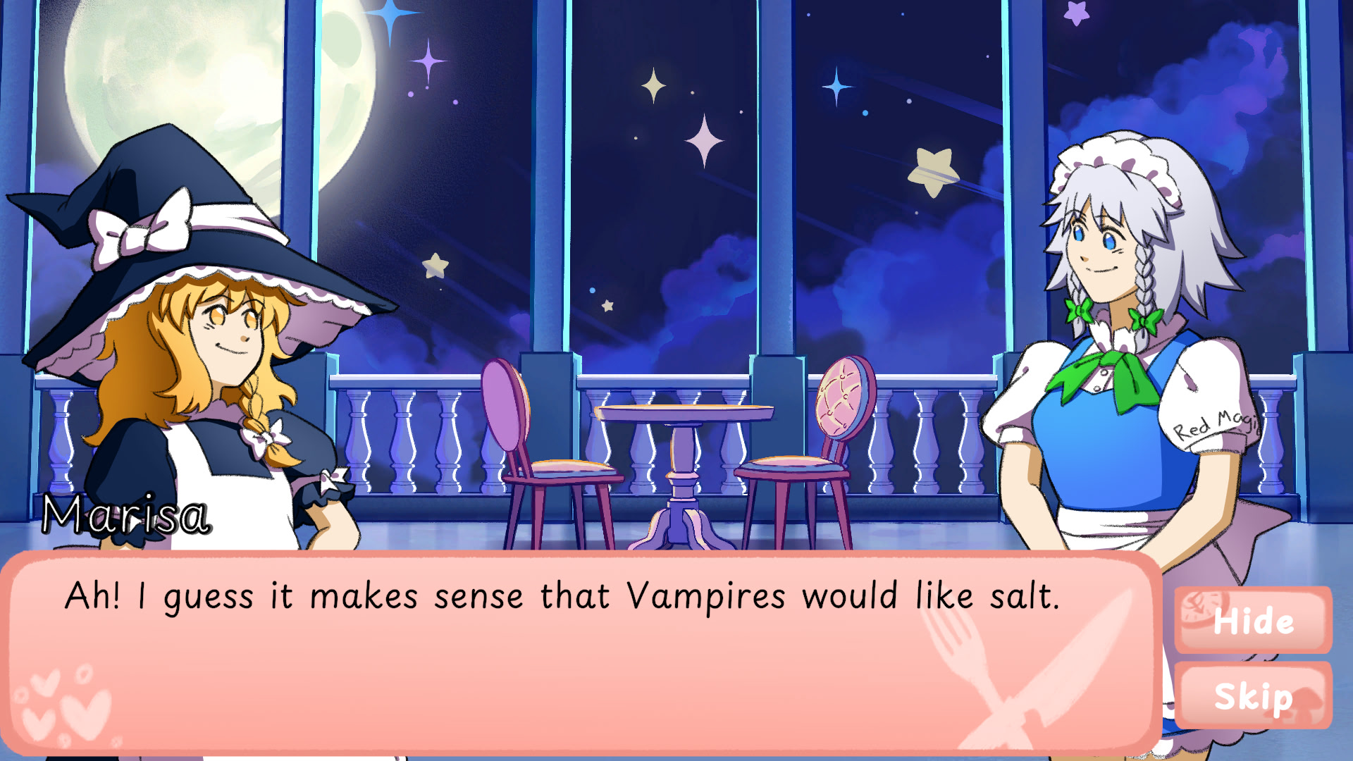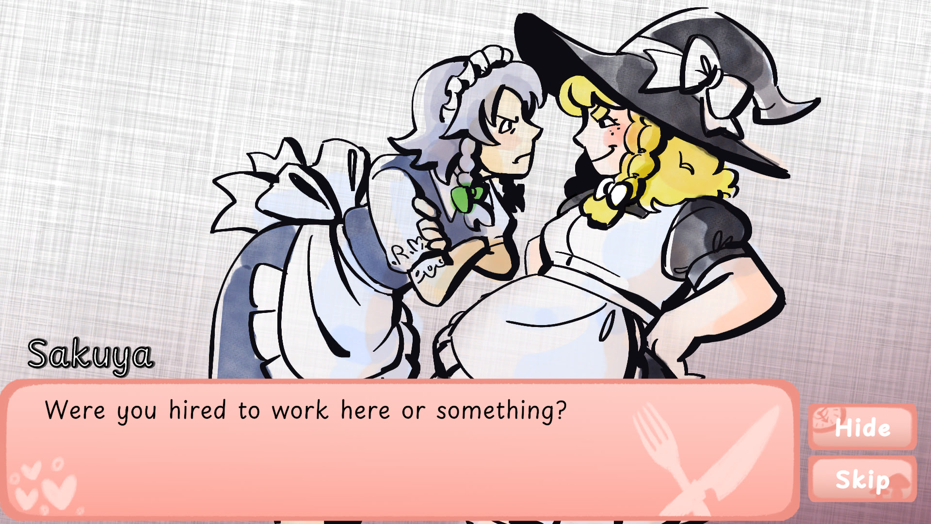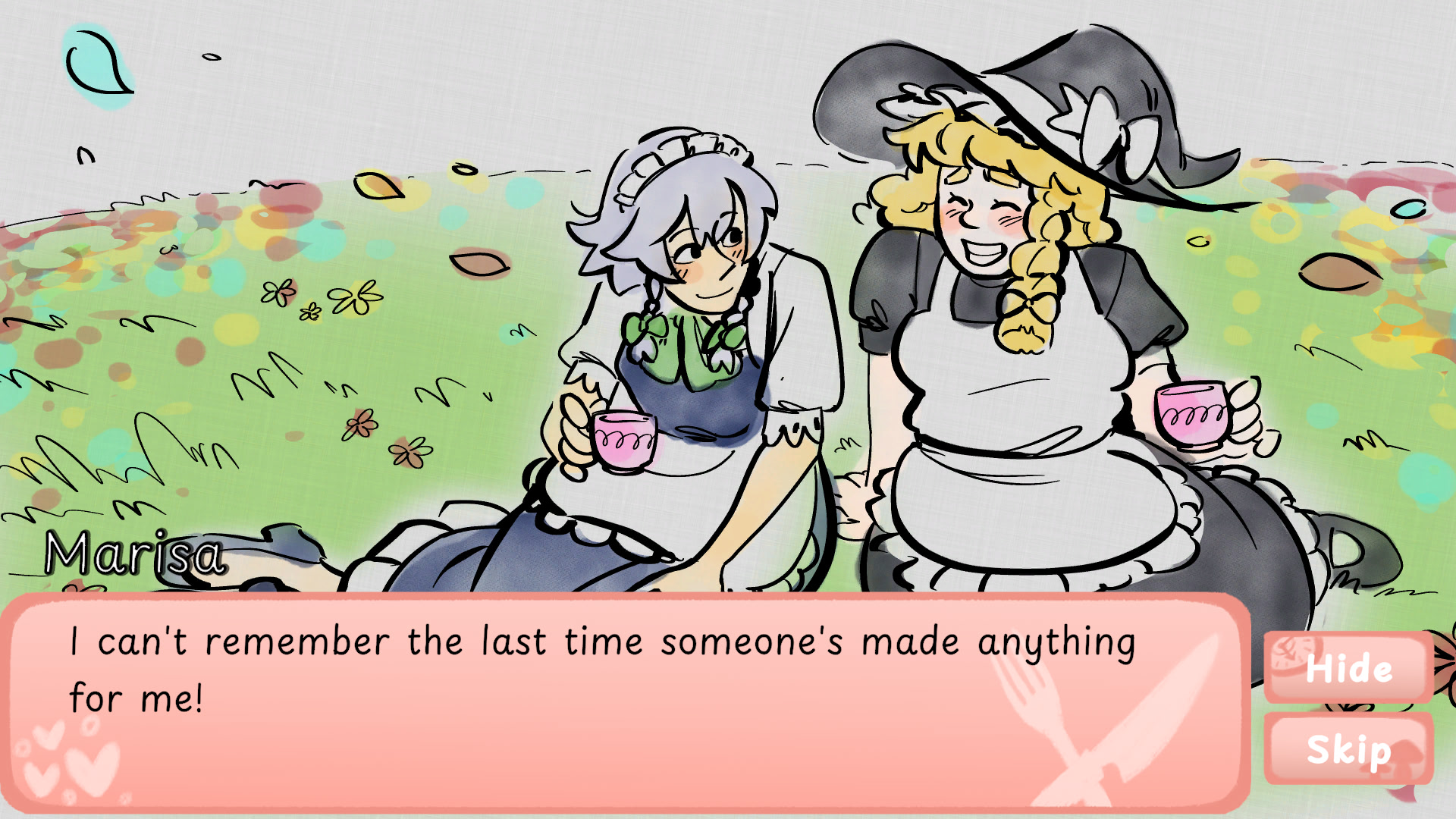 A fusion of a cooking game and a visual novel. The game explores Marisa's journey to understand how she feels about Sakuya.