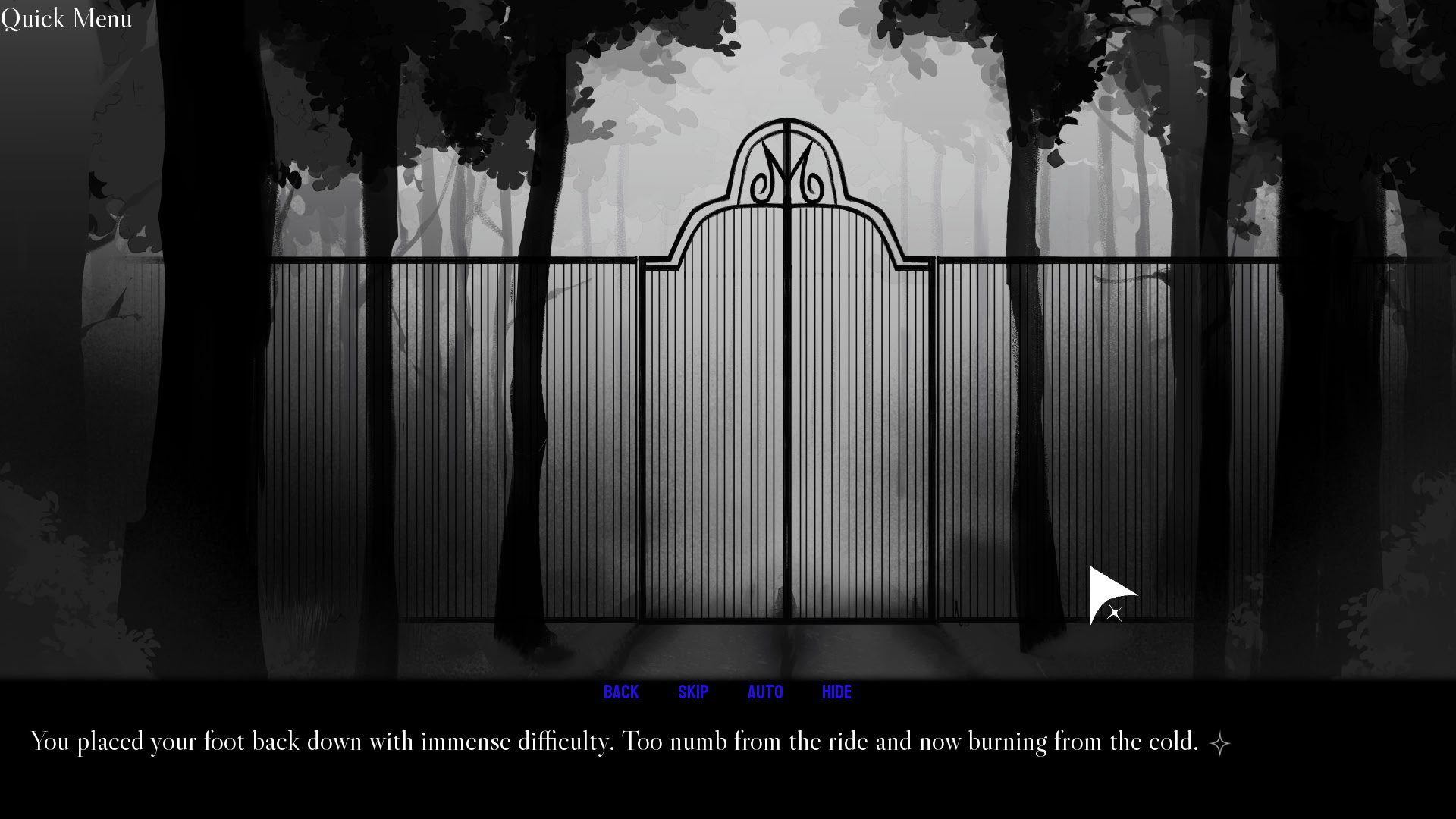 "You" are this year's sacrificial "spouse". Sacrifice to the Lord of the land living on the outskirts of your village. No one knows what became of them once they stepped foot past his gates. Will you survive or die trying like the rest? itch.io]