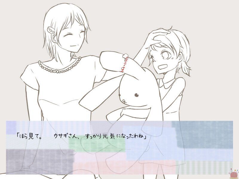 If damaged stuffed animals can be fixed by sewing, why not me? This game has a main theme of self-injury (body-stitching) to embroider one's own body, so some texts and illustrations have grotesque depictions.