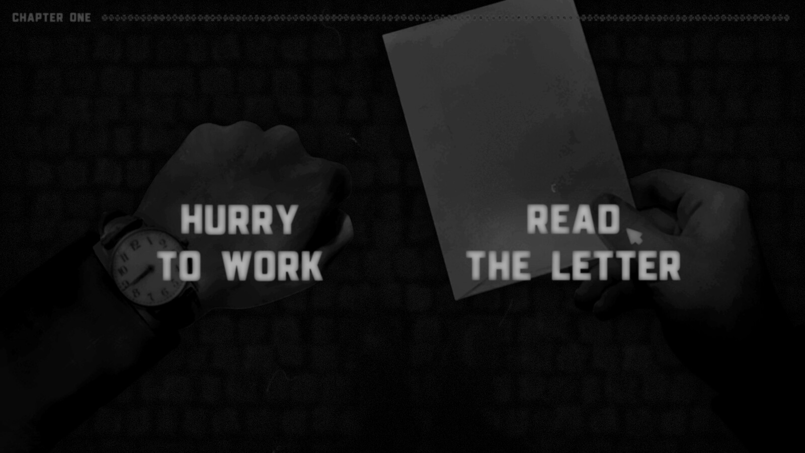 This is you, and this – is You. Both of you have something in common – exceptionality in a monotonous moment of time, when meaningless decisions have to be made. Or meaningful, to such an extent, that there is nothing left once they are made. Who knows what awaits you around the corner – will you go to work in a continuous, 'almost-holiday' fever or wander in a labyrinth of crooked mirrors? Except for his name, it seems our character’s life is nothing more than unexceptional – there’s no room for miracles or cobwebs. The room is filled with office papers, some vaguely familiar family members, an ailing story of sensation, a couple of dropped lines and a sharp drop – a circle, inside and outside of which you and You wander. Open the letter, pick up the phone, speak up or step aside – and this story will gain new fractures and reflections.