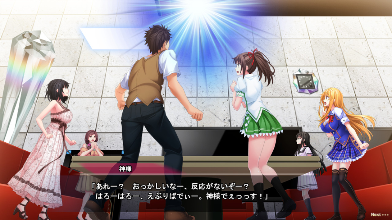 Kazuma suddenly found himself trapped in an unfamiliar room with 5 women: his cousin Kokoro, her classmate Moe, the daughter of a noble family Kotoko, medical school student Mitsuki and the married wife Yuriko. They were all confused as to why they were there, and a light appeared above them and started to sing: