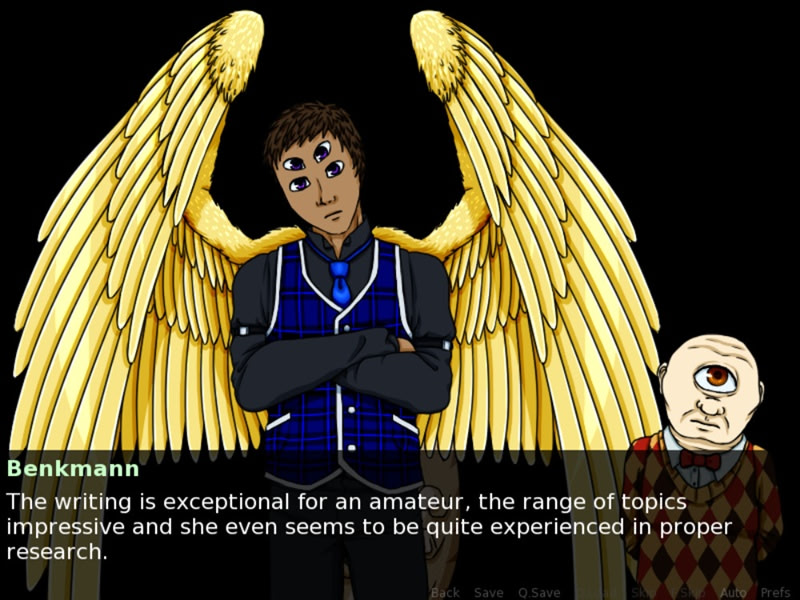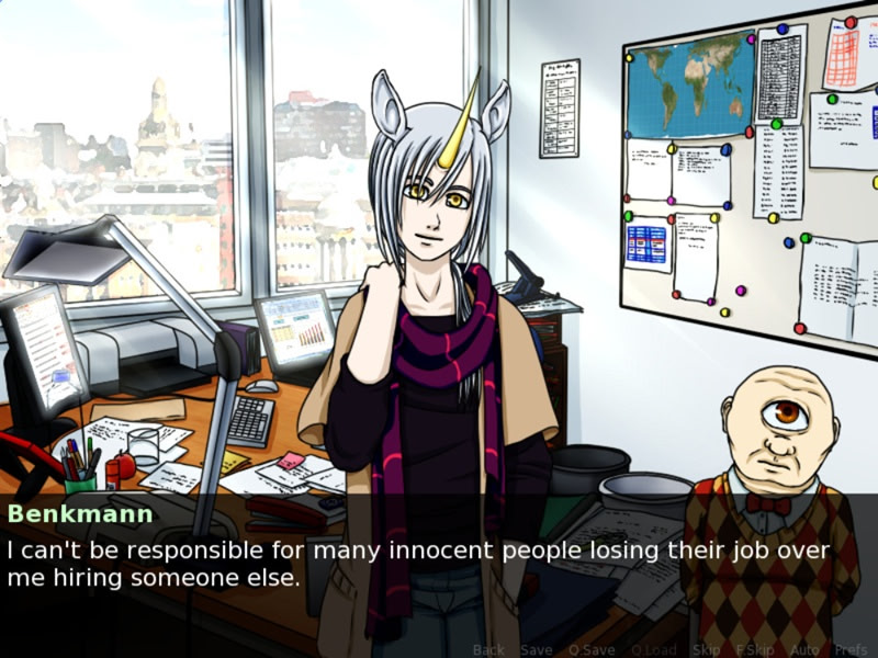 Benkmann got an application from a person that he'd rather not even acknowledge existing, but at the same time it is such a brilliant writer that he feels guilty. So he could ask one of his subordinates to help him decide...or maybe just meet what he feared for so long. itch.io]