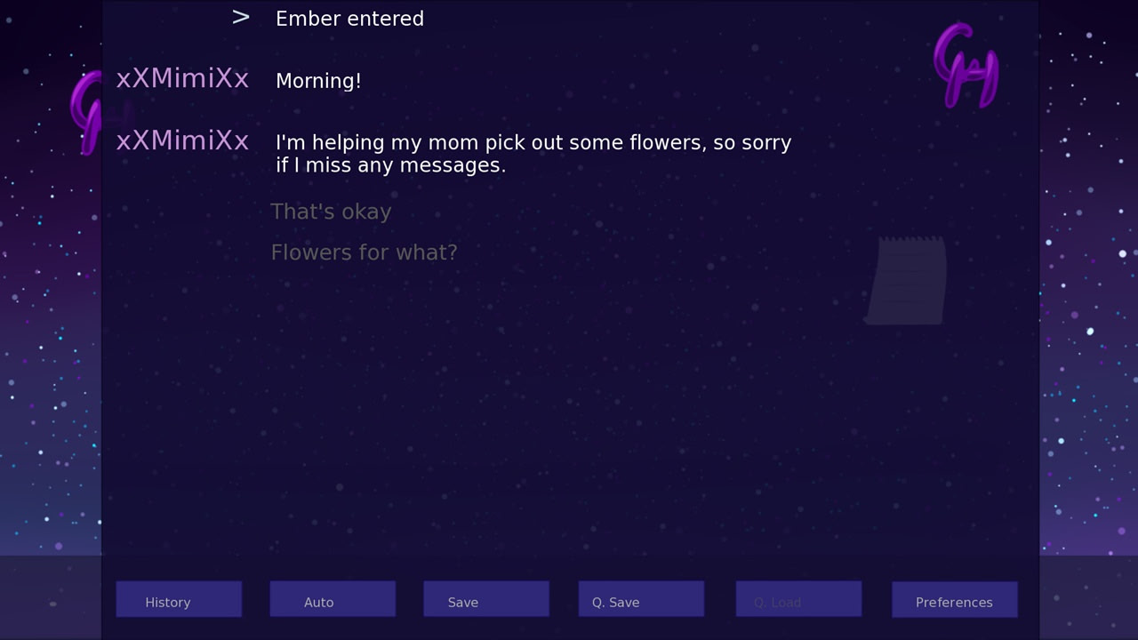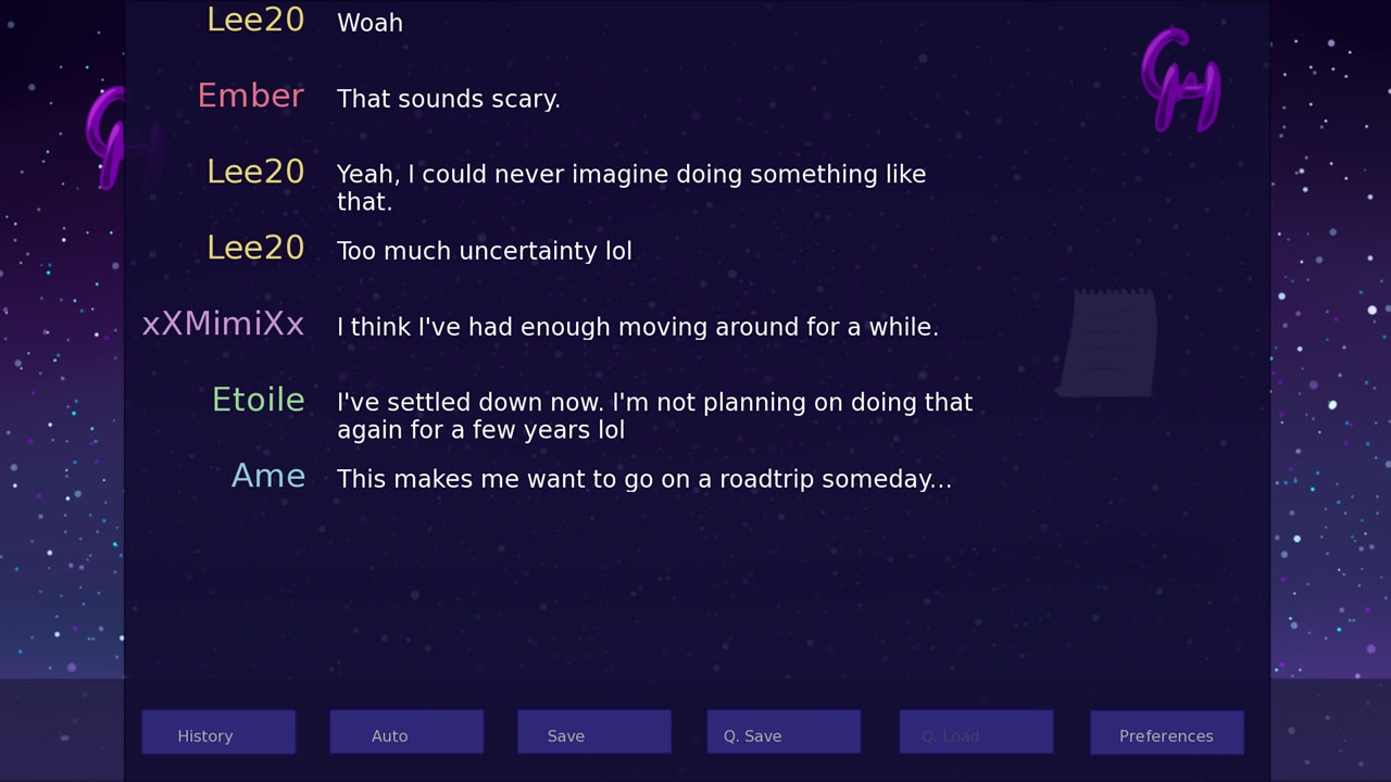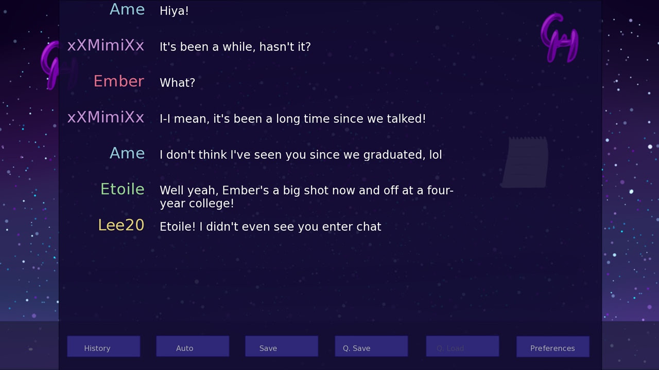 A group of high school friends reunite over a chat room and try to relive the good times of when they were all together, but can their friendship endure the lost time? itch.io] Entry for Ludum Dare 37.