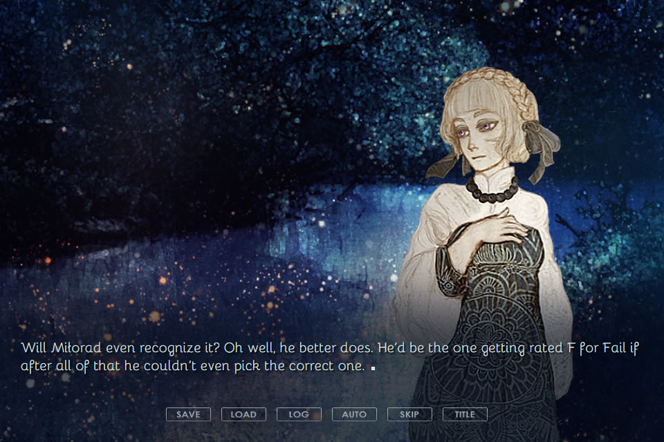 A short visual novel inspired by Slavic mythology set in a present world where monotheistic religions never existed and everyone still worships the old gods. Two romantic options are present and the game includes a glossary of terms.
