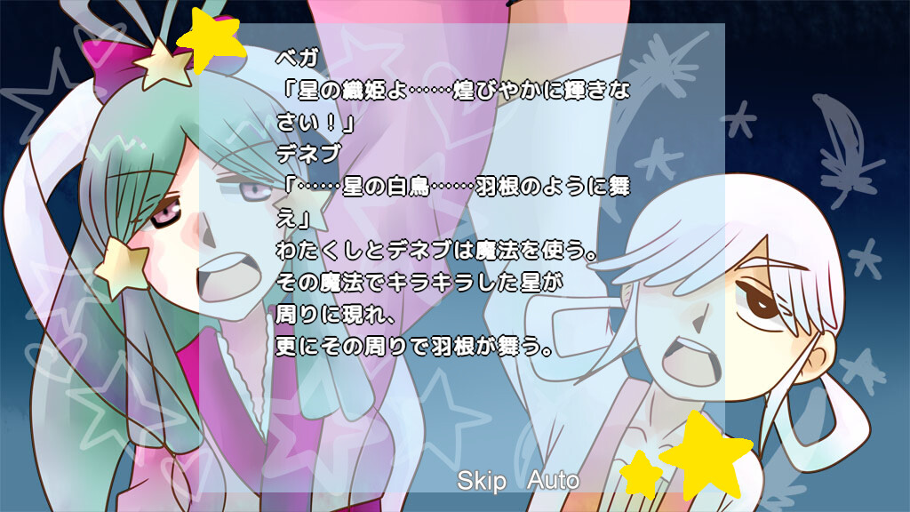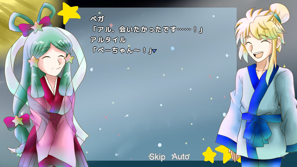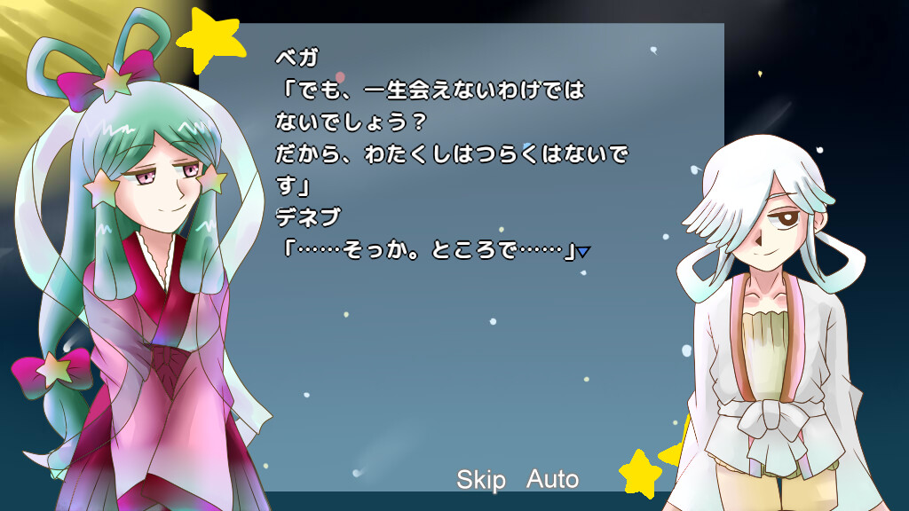 It's the 6th of July; the Star Festival is tomorrow. That's the day Vega and Altair meet, once every year. Vega couldn't contain her excitement. Then, Deneb came along. "Since the Star Festival's tomorrow, we're gonna be doing something to celebrate, right?" Vega seems to have an idea... Freem!]