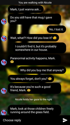 Seen is an interactive story set in high school where you play as Mark Blythe, a student who fell in love with the new fellow student, Nicole Tyler. Do you have what it takes to catch her heart?