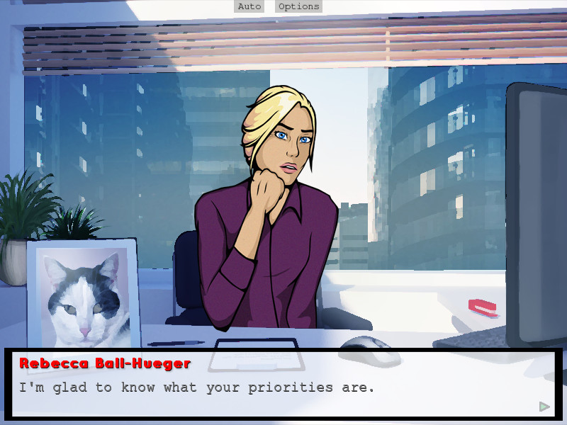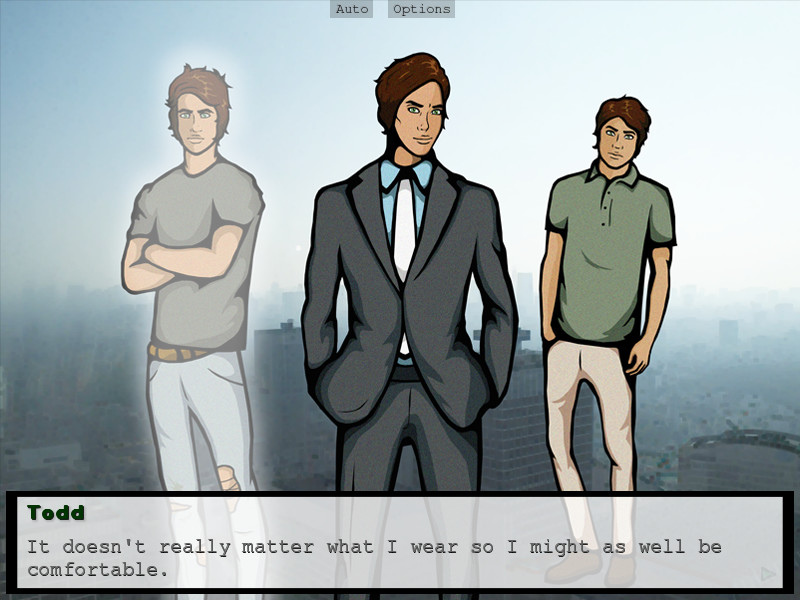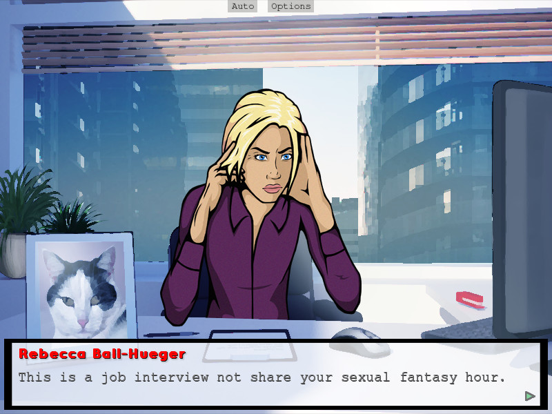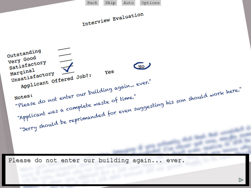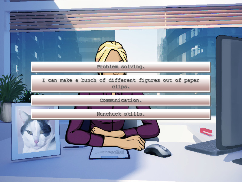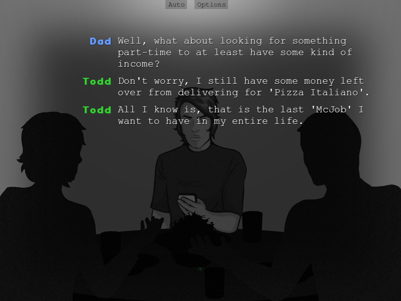 “Get A Job!” is a visual novel about a twenty-something college graduate trying to find his place in the world. You have been pressured into going to a job interview by your father whose sole purpose seems to be pushing you down the same path he took. Do you follow in his footsteps and try to make your father proud or do you try to discover your own? The choice is up to you.