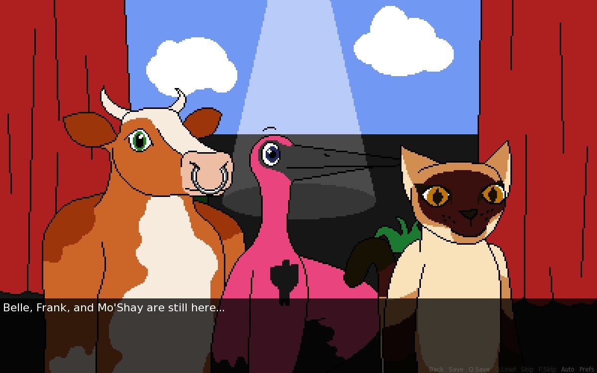 This game was made as a part of the 2016 NaNoRenO game jam. You play Jojo, a rabbit that is stage managing her school's winter show. Some Features Include: - Three characters to meet - Seven endings - 4000+ words - Teenage awkwardness - Pixel art Itch.io]