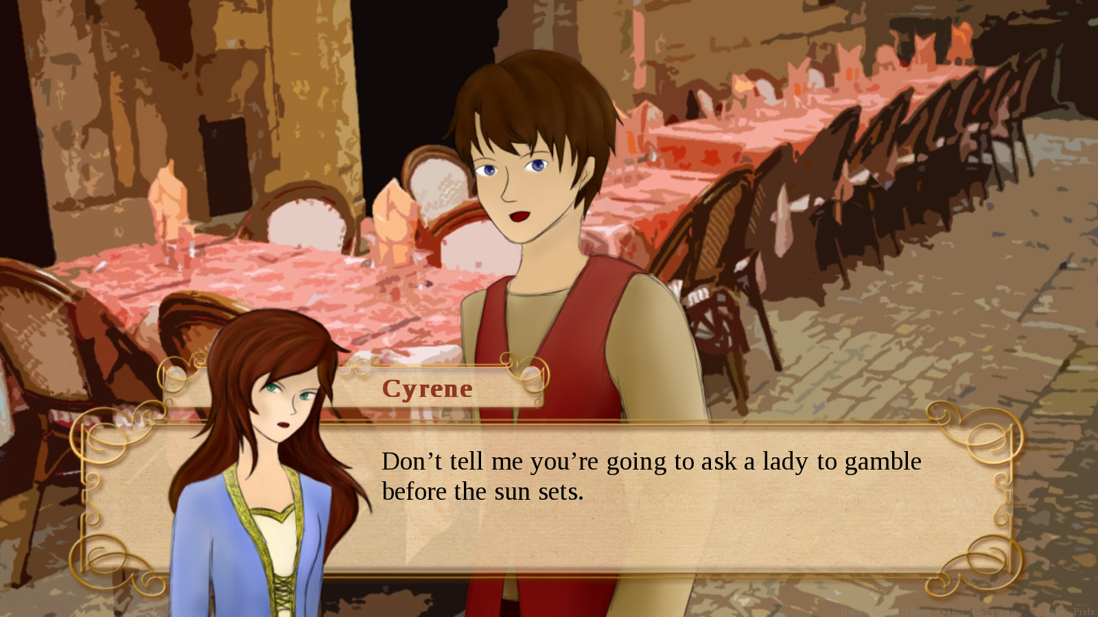While her peers dream of perfect love, Cyrene’s struggle is far simpler: she just wants to marry. Yet the question remains – can she sacrifice her present life for the family she might someday have? A new encounter could change her perspective. Lemmasoft forum]