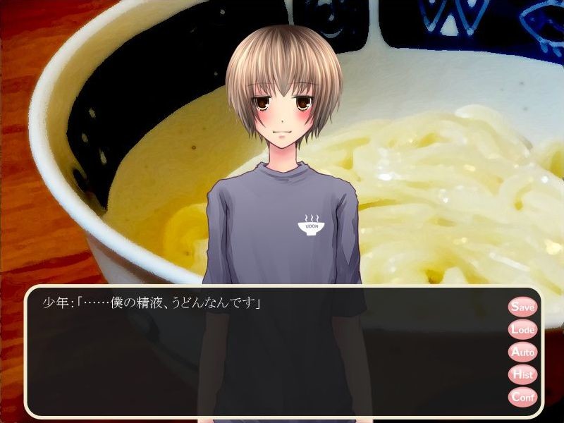 A young man is kidnapped and seduced by a boy who ejaculates udon.