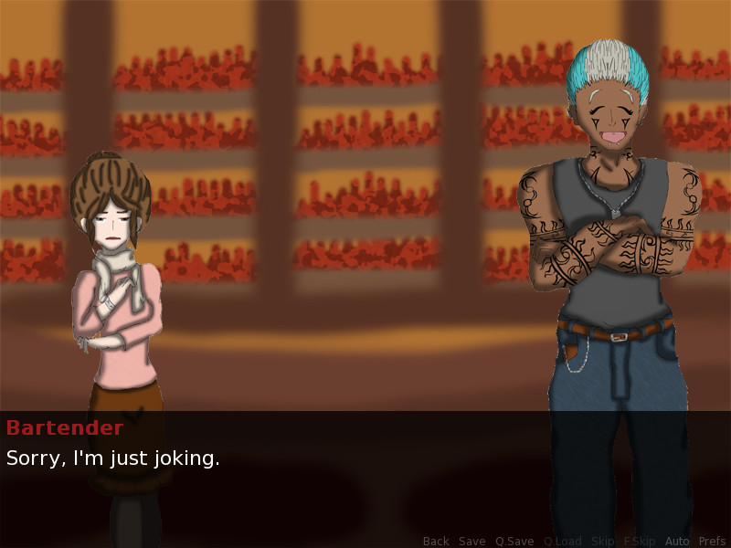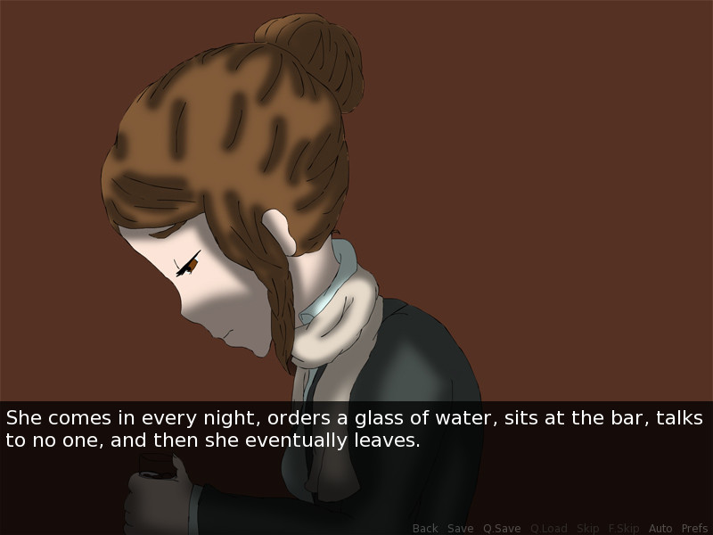 A bar not known for being in the "good side of town" or where well dignified people would go. The owner and bartender of the place itself is a tall, muscular man, tattooed head to town and covered with piercings. But one month, the bartender notices a rather modest looking woman coming in almost every night doing nothing but ordering a glass of water. Intrigued, the bartender can no longer go on in silence at the odd sight and talks to the woman.