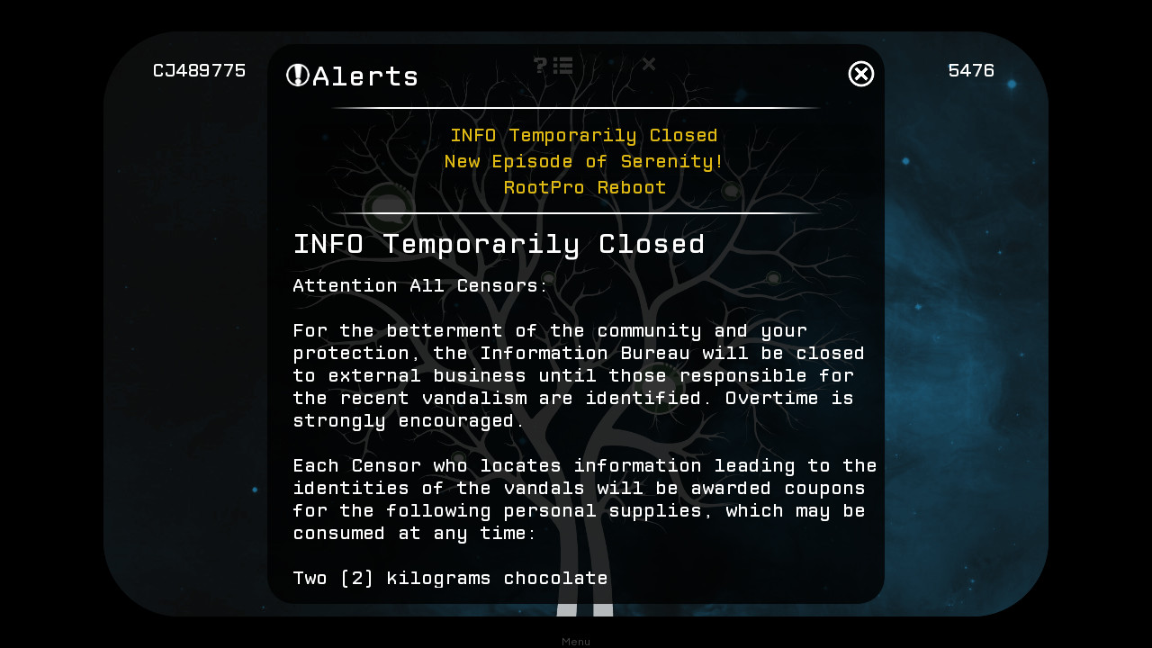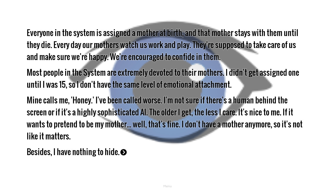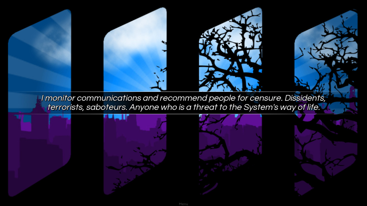 The Censor is a dystopian visual novel. After years spent assimilating into the System, CJ489775 is visited by a ghost from her past and must decide whether to support the System or those who live Outside.