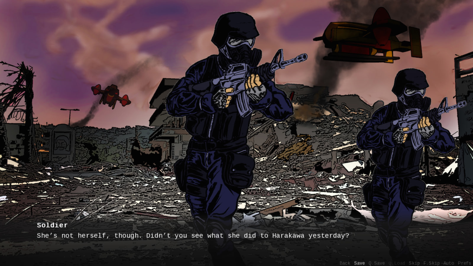 After Tomishogo falls to a bio-disaster, its residents become superhuman threats. Trapped within, Agent John Oswald must wield his powers, protect a young girl, and find a way out. Itch.io]