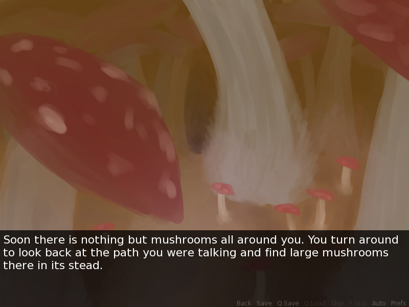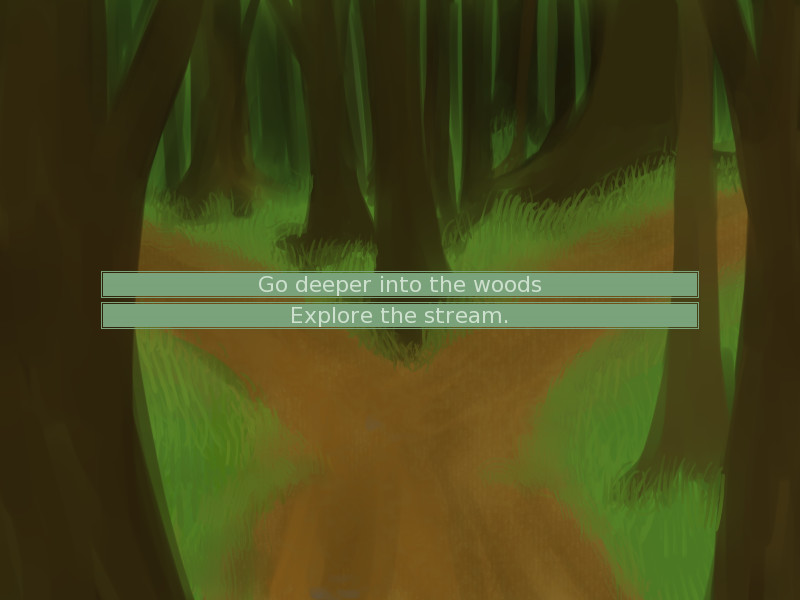 You play as an unnamed protagonist who finds themselves walking in a forest. The forest is a large and dangerous place. It is up to you (the player) to choose where to explore and what to do. Be careful though, as many of your choices may end in death.