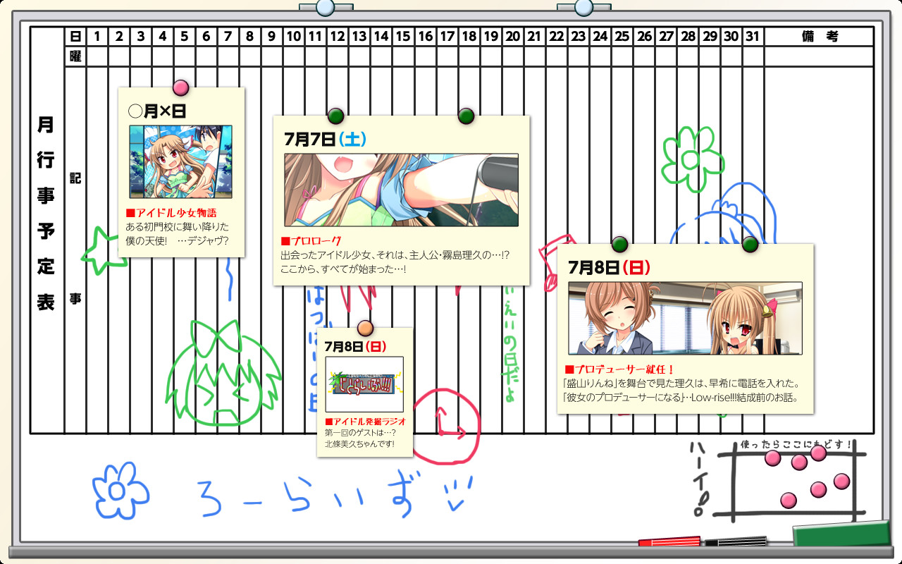 Riku left his job of 3 years to enjoy an extended break. One day, his aunt called to ask him to become a producer at her new idol production studio. He did not show much interest at the idea, but she suggested that he come watch a mini concert by one of her idols on the rooftop stage of a department store. There he saw his cousin Rin, who he had loved like his own imouto, giving it her all in a spirited yet amateurish performance. Afterwards, he was named as her producer. With the addition of his clumsy imouto Nono and her energetic classmate Kogiri, the SLG (semi-little girl) idol unit “Low-rise!!” was formed!