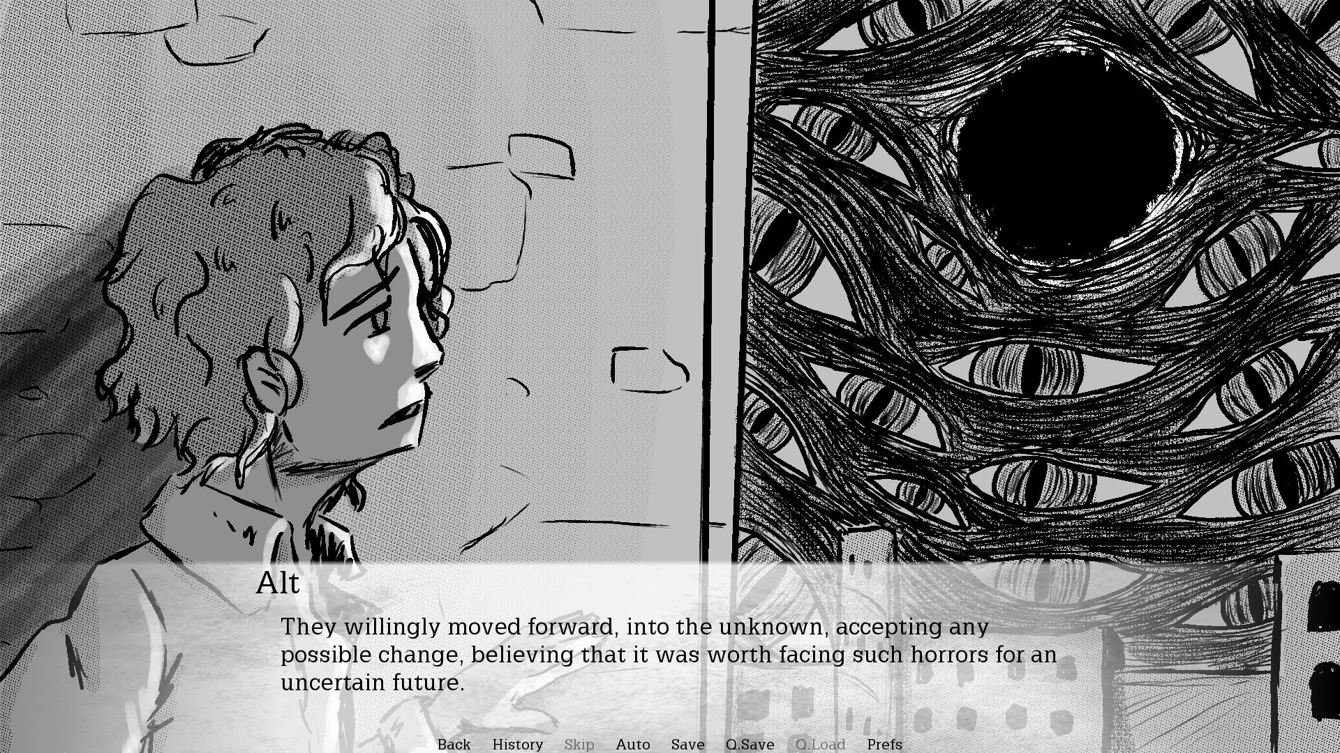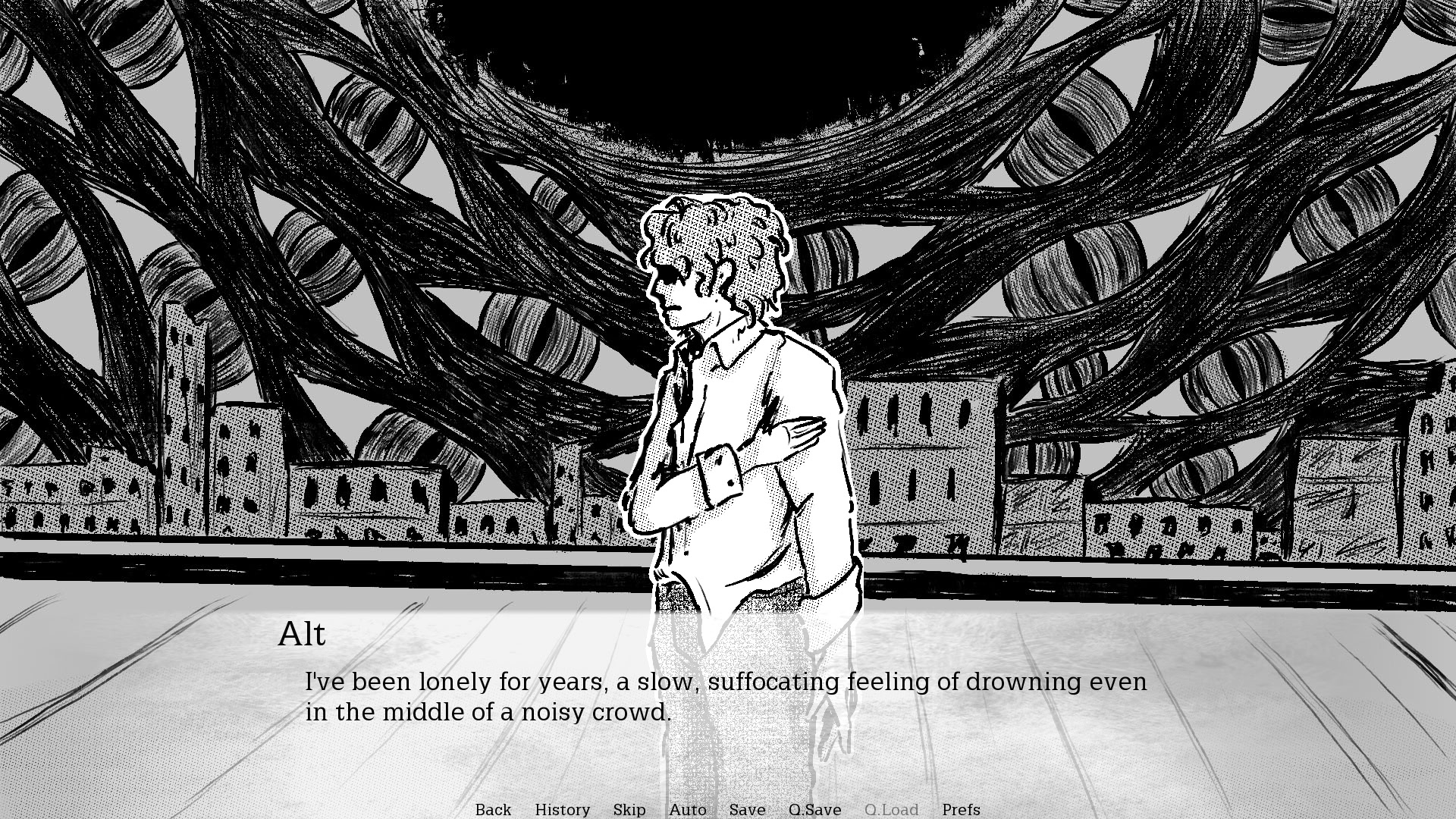 The world ended. Alt, still alive somehow, makes their way through an abandoned city and faces a choice.